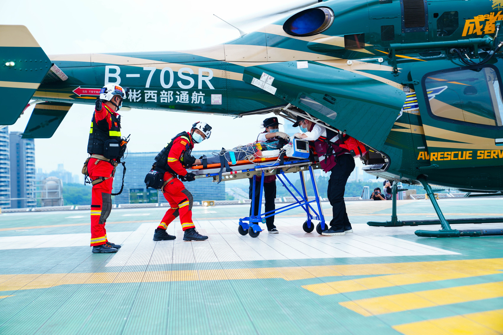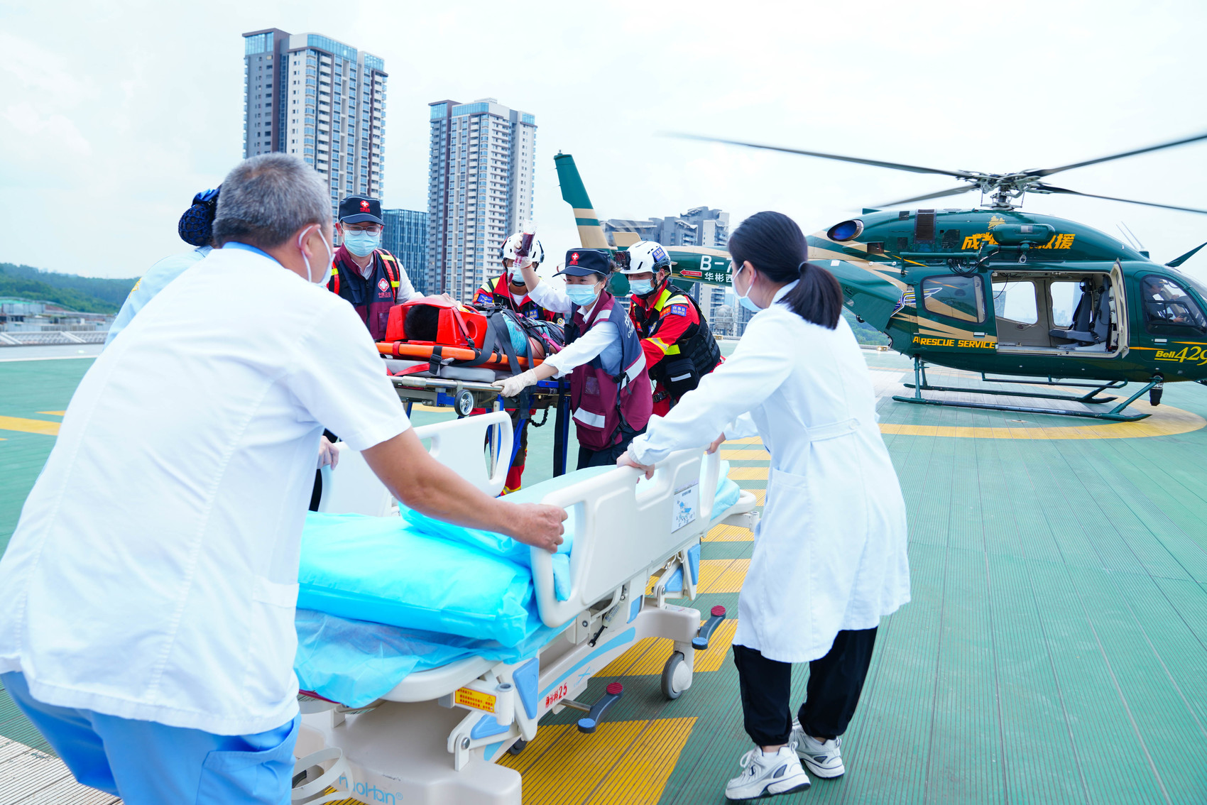 直升机降落后,华西天府医院急救团队通过专用液压升降机与电梯,将患者从停机坪直接转运至急诊抢救室,经过数小时手术抢救,李某最终脱离生命危险。这种纵向通行设计大幅缩短从空中转运到院内救治的时间。