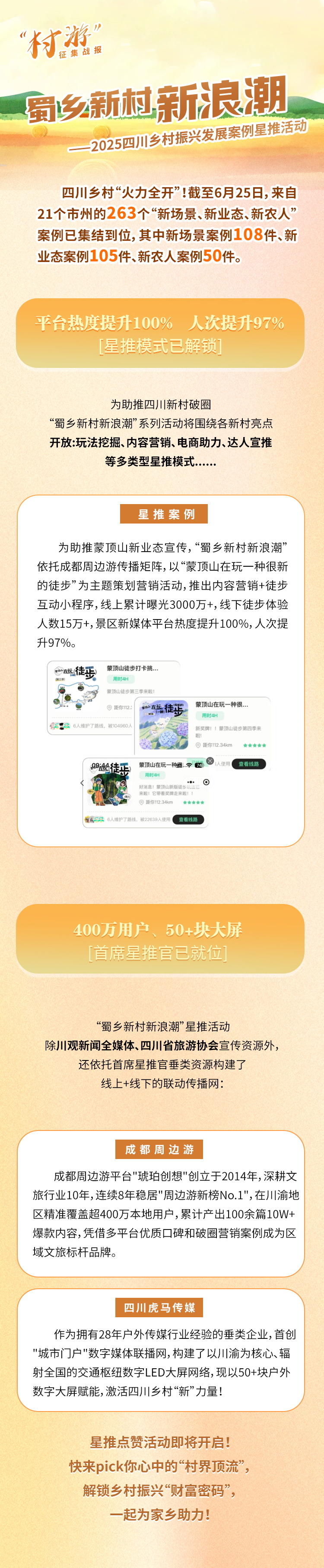 2025“蜀乡新村新浪潮——2025四川乡村振兴发展案例星推活动”启动以来,四川乡村“火力全开”。
