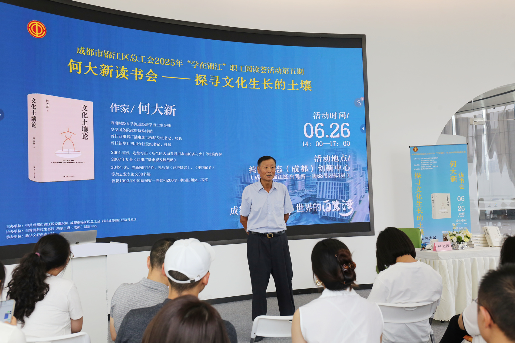 6月26日,鸿蒙生态(成都)创新中心内书香与科技气息交融。一场由成都市锦江区委组织部、锦江区总工会、四川成都锦江经济开发区联合主办的“学在锦江”第五期职工悦读荟活动——何大新读书会圆满落幕。西南财经大学流通经济学博士生导师、四川大学文学院兼职教授何大新带领白鹭湾科技生态园职工代表,用一场“探寻文化生长的土壤”之旅,让“幸福锦江”更有温度、更有质感、更有内涵。