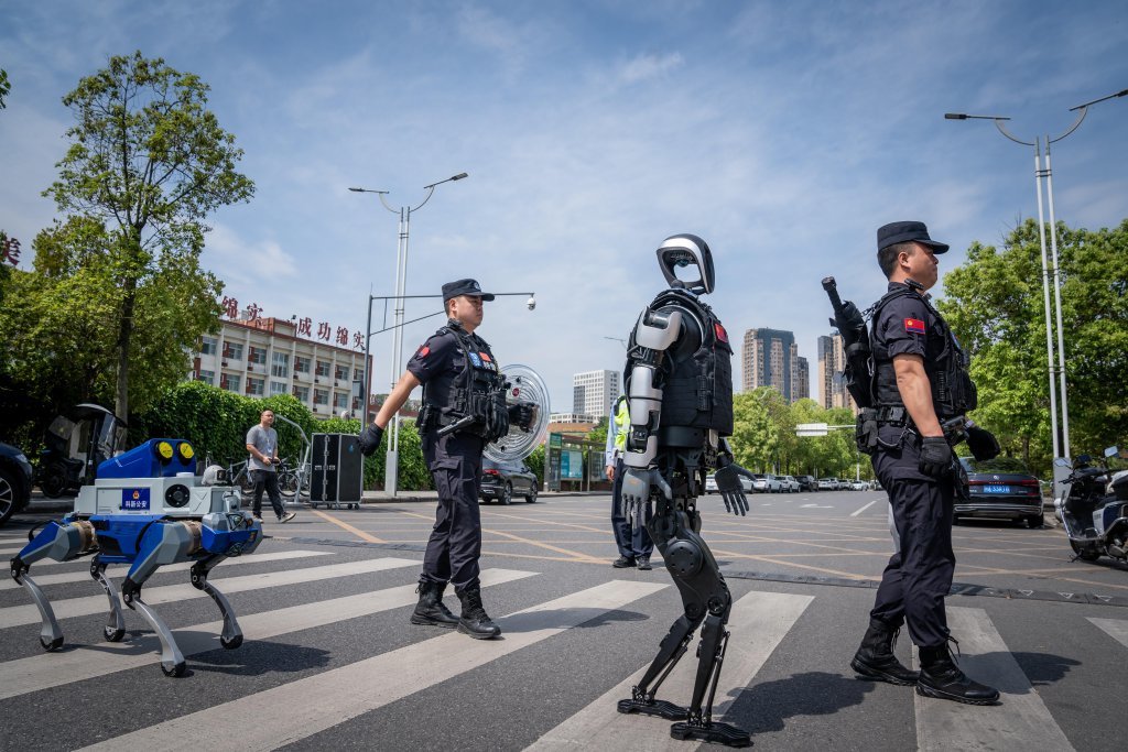 “绵阳造”人形巡逻机器人及机器狗配合民警在辖区开展巡逻防控(唐超 摄)