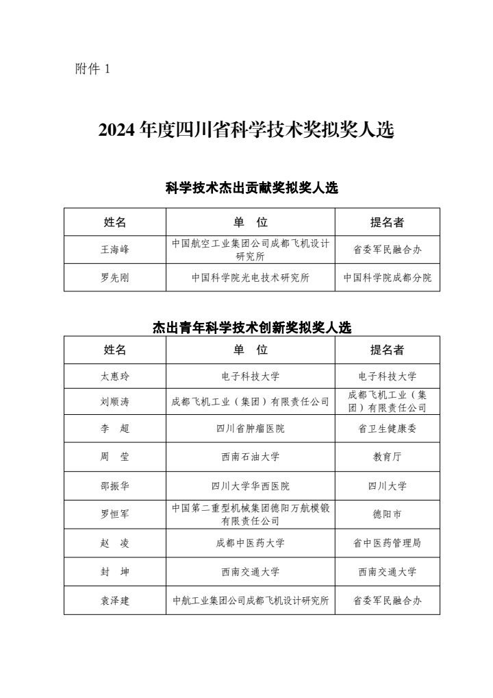 附件:1.2024年度四川省科学技术杰出贡献奖、杰出青年科学技术创新奖拟奖人选