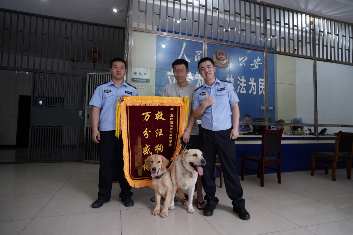 不久后,两条走失狗狗再次来到派出所,为民警代嘉骏送上写有“救汪狗命,万分感谢”的锦旗,感谢派出所民辅警帮它找回主人。