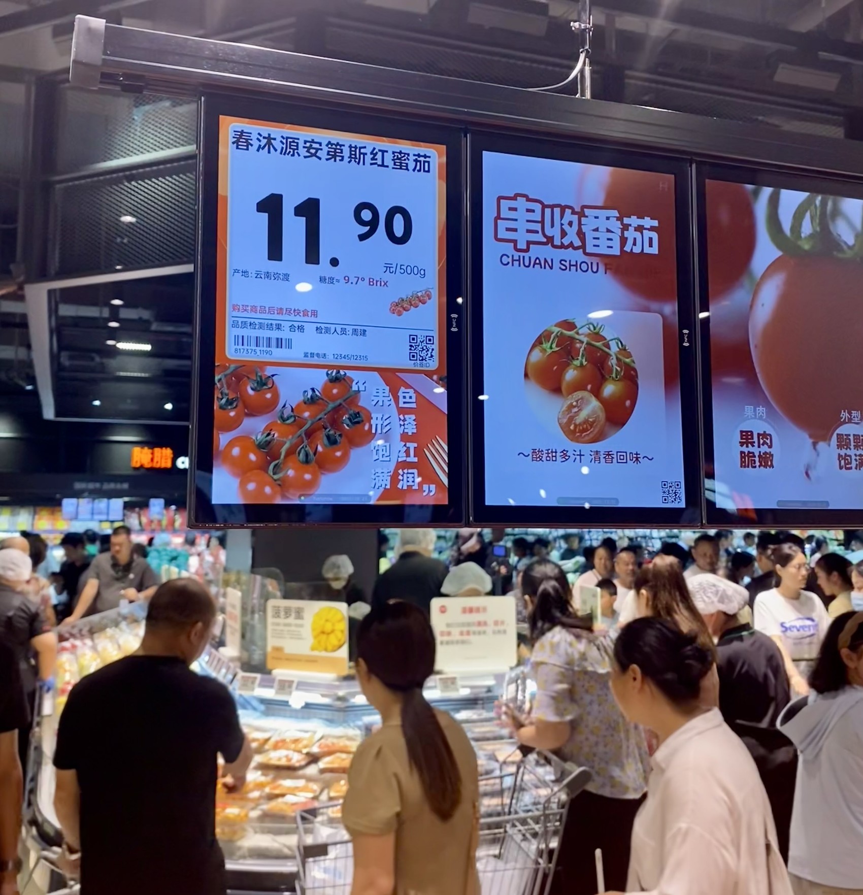 走进店内,人头攒动,生活用品、熟食、生鲜等区域有着明确标识,一目了然。琳琅满目的各类商品,鳞次栉比地排列在货架上,横平竖直的瓜果蔬菜,按照同色系、同角度统一摆放,令强迫症极度舒适。