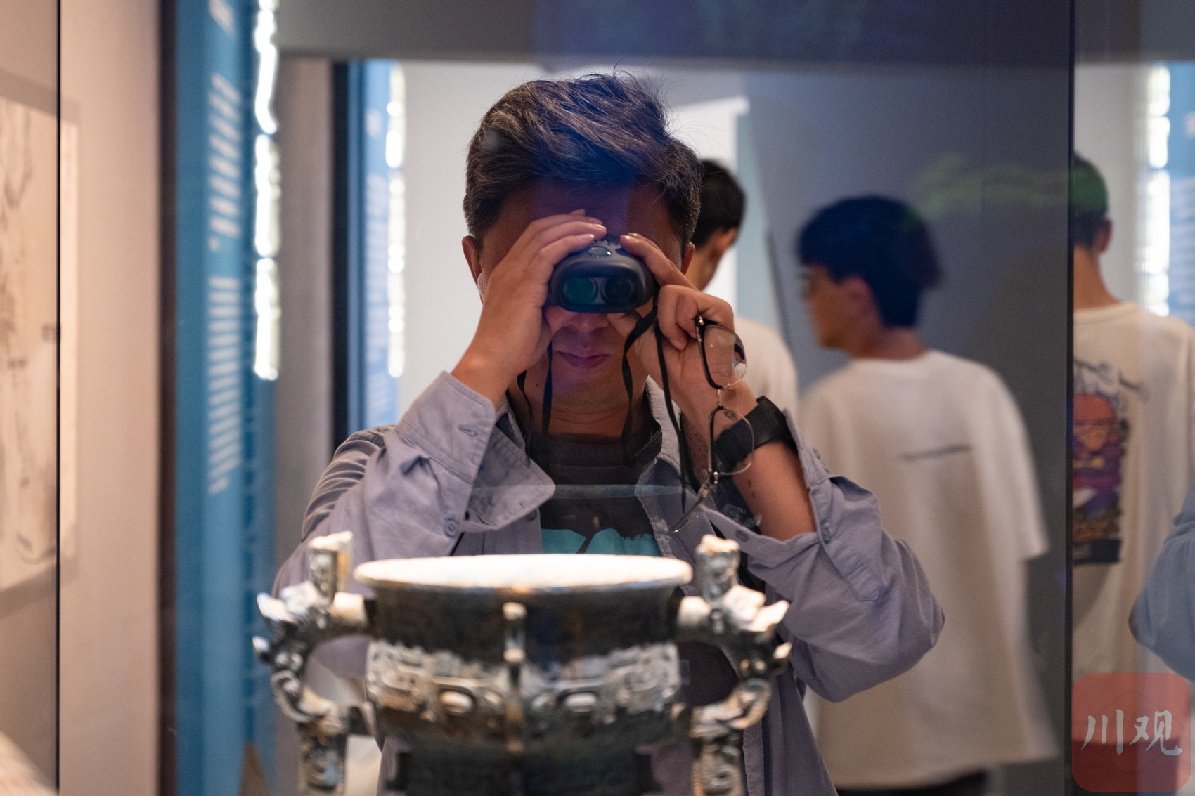 6月27日,观众在成都博物馆用望远镜观看展品细节。