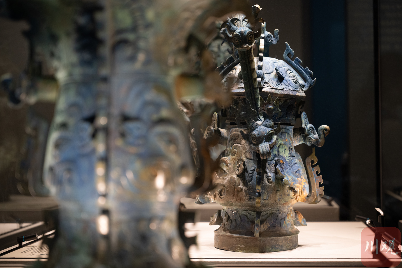 6月27日,在成都博物馆展出的神面纹卣,该青铜器因特殊埋藏环境形成蓝色锈蚀而“走红”网络。