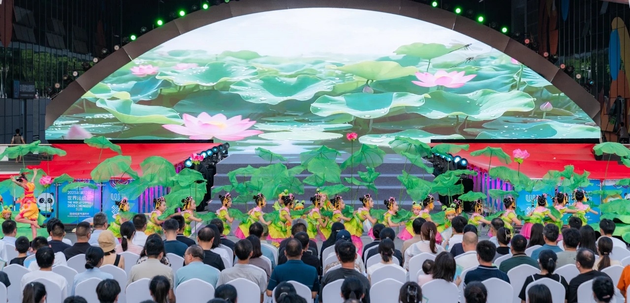 活动分为“红心永续”和“活力新都”两大篇章。开场舞《夏日荷塘》由兴乐路小学学生表演,孩子们的灵动舞姿融合了桂湖荷韵与香城体育中心“水润香城”的设计灵感,赢得现场阵阵掌声。
