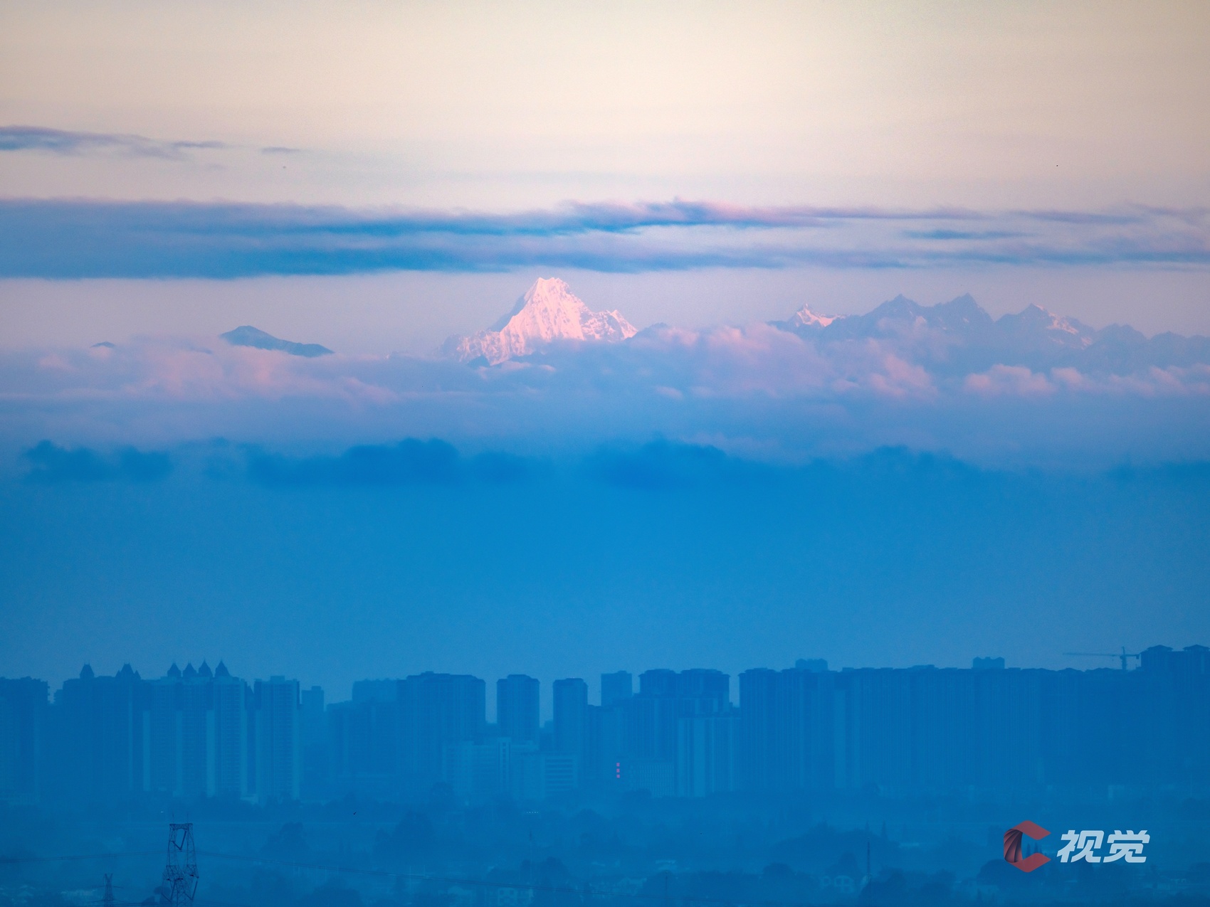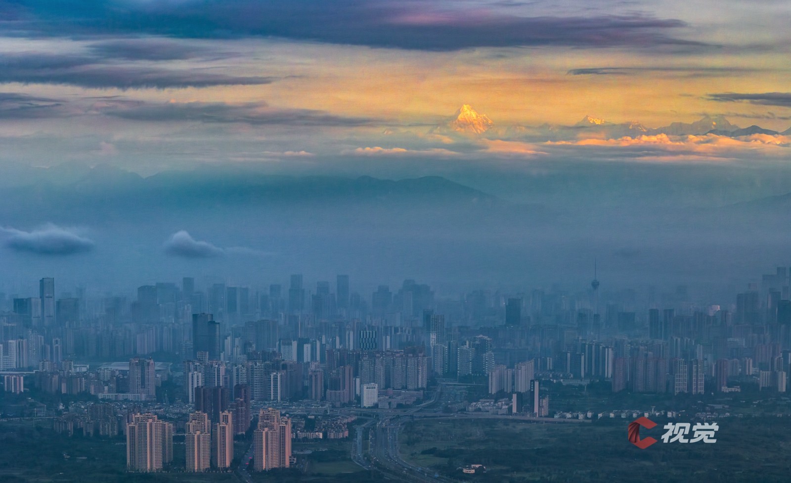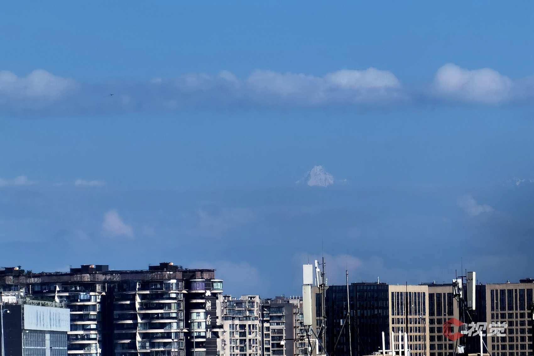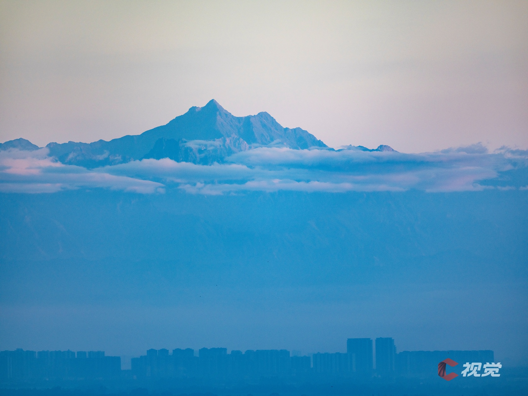 在成都市区,遥望云端之上的巍峨群峰。C视觉签约摄影师 沈军