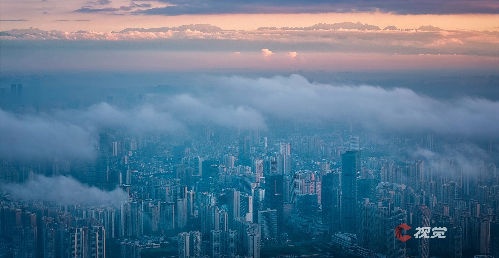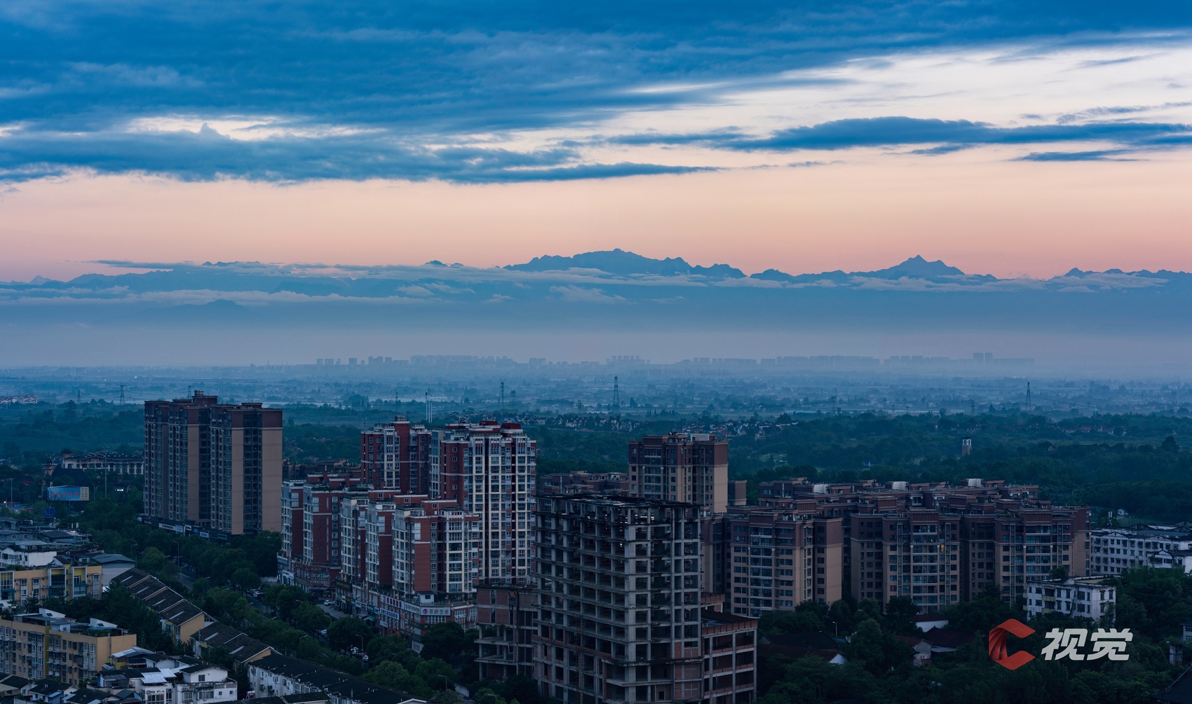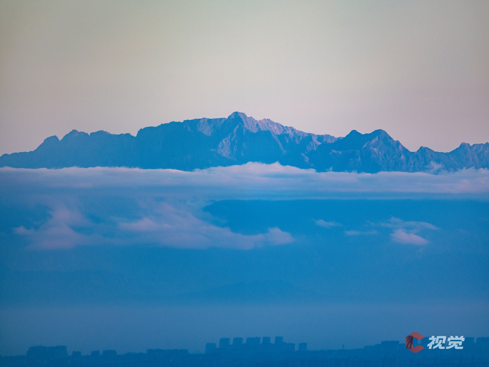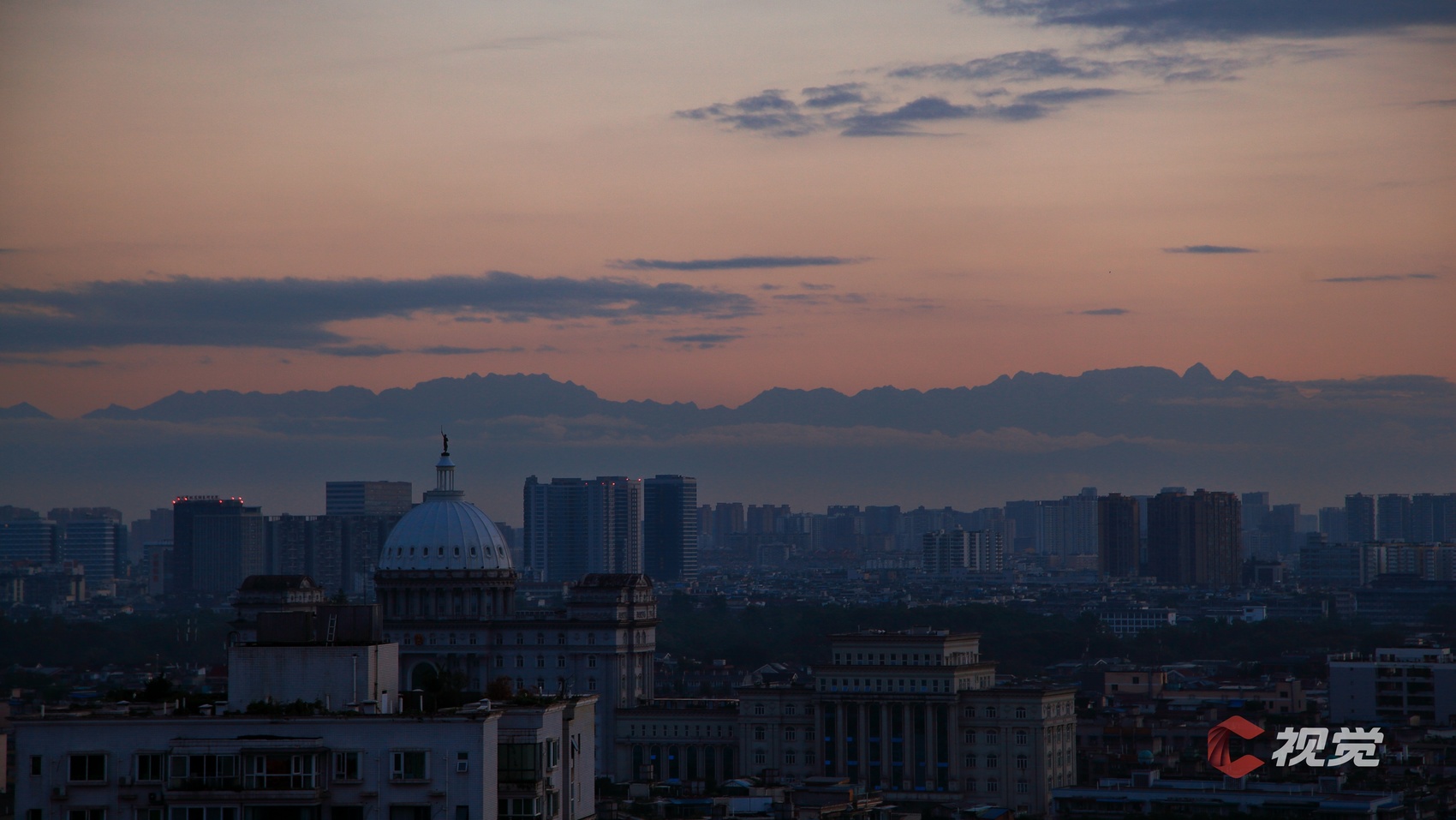 在成都市区,遥望云端之上的巍峨群峰。C视觉签约摄影师 沈军