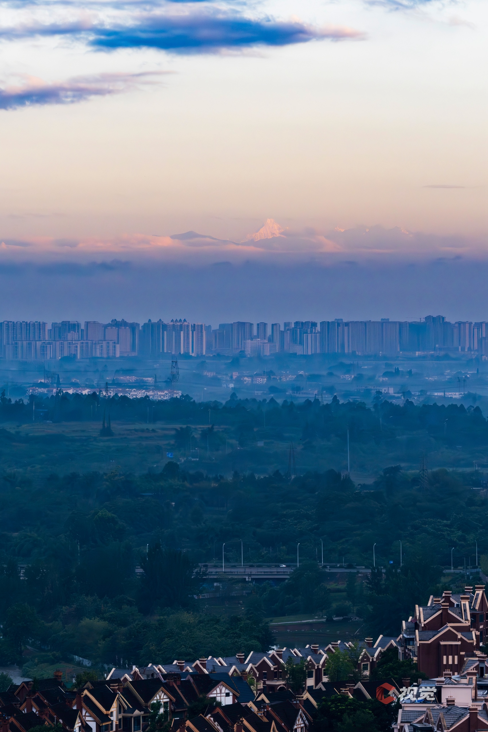 在成都永丰立交桥遥望被薄雾笼罩的雪山,幺妹峰也“羞涩”露头。C视觉签约摄影师 李明成