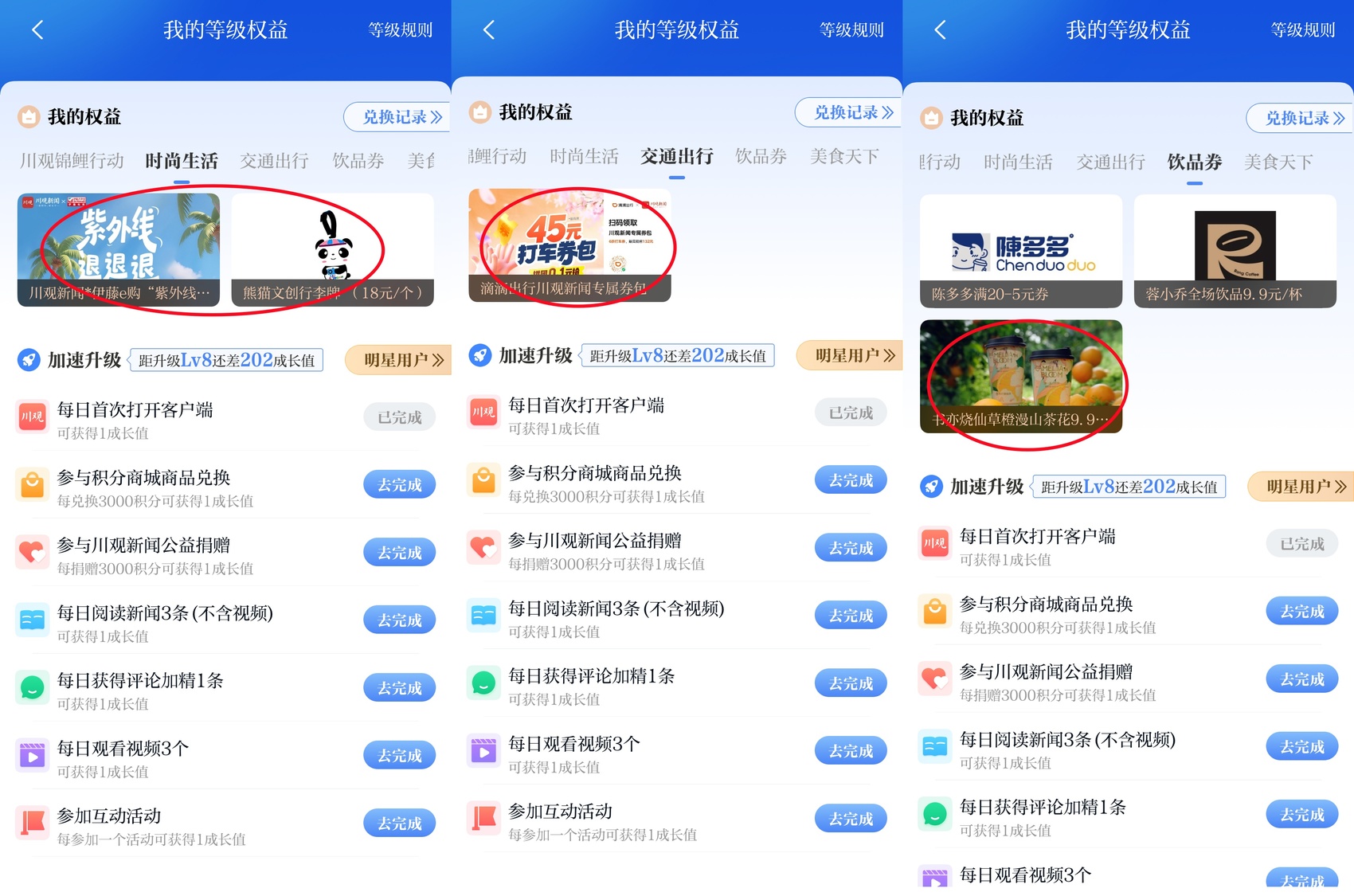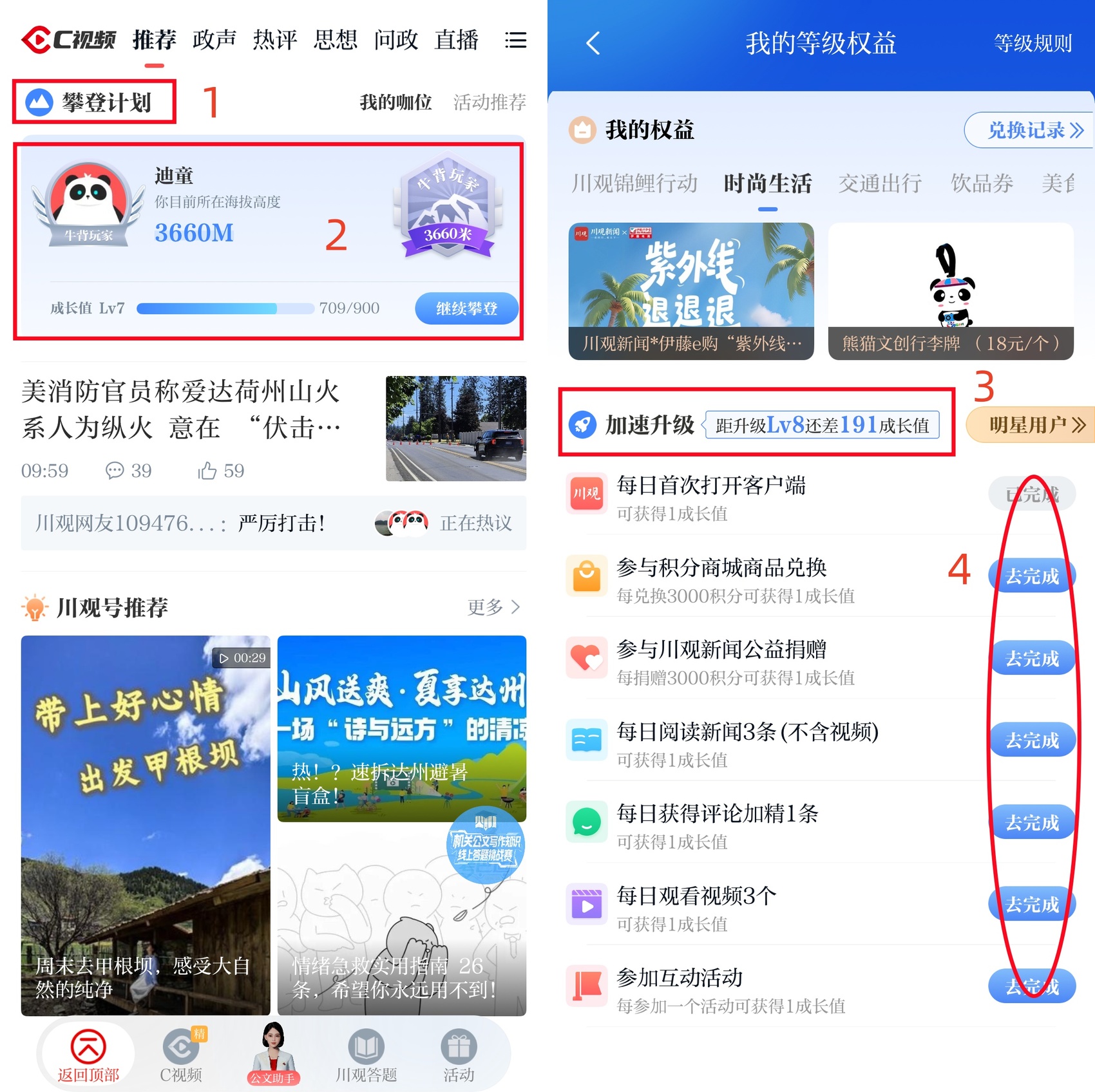 “攀登计划”中,川观用户的头像、称号、勋章会随着等级的增加升级,目前,已有6名用户已经达到最高等级——LV12,晋级到“贡嘎王者”。每一款权益产品,只要达到特定等级,即可免费兑换,大家加油攀登升级吧!