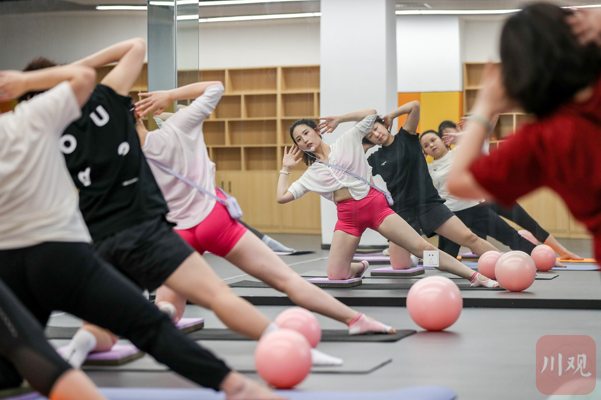 6月10日,宜宾市工人文化宫“工会夜校” ,学员们正在进行垫上普拉提课程。C视觉签约摄影师 庄歌尔 摄