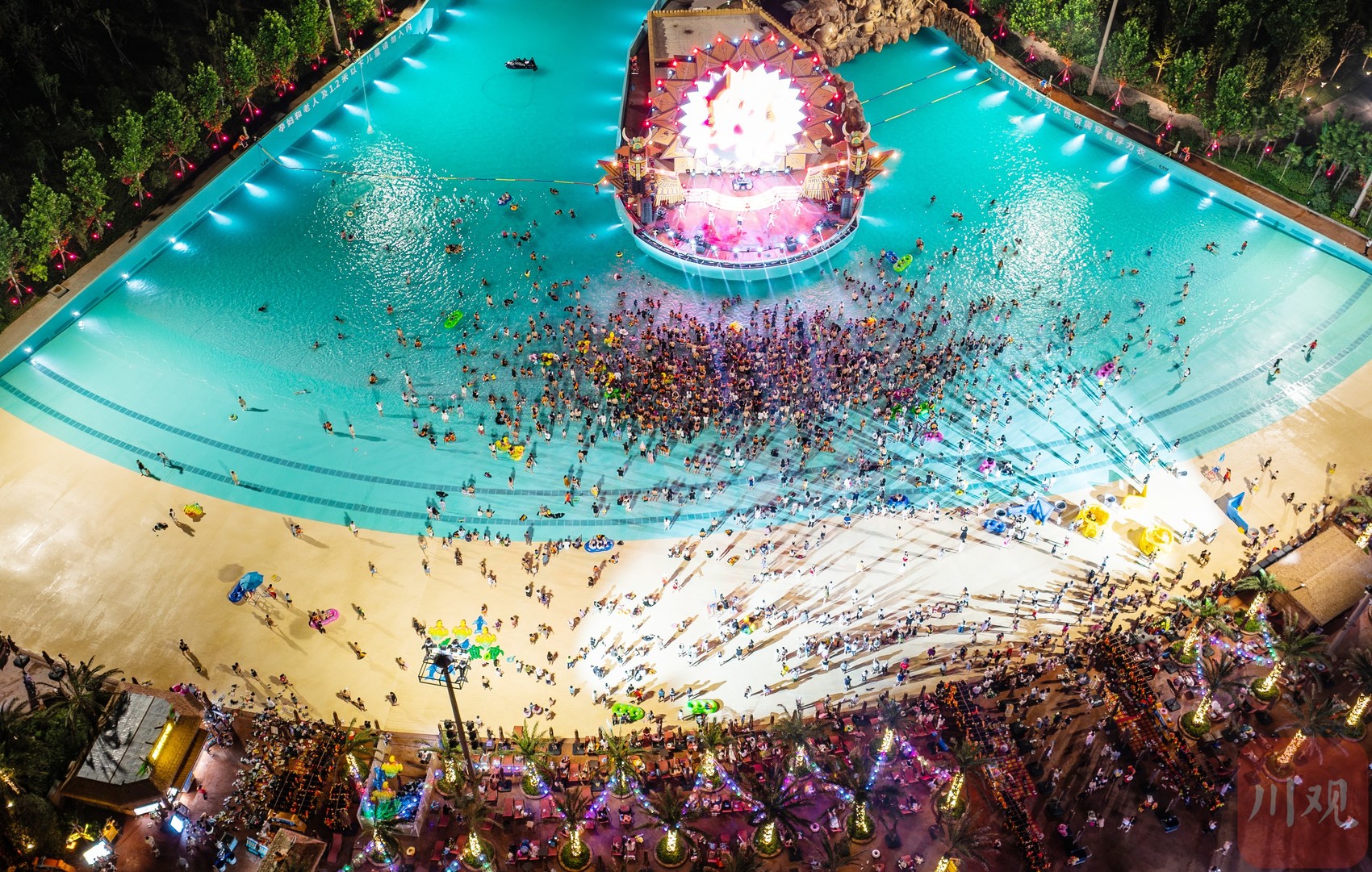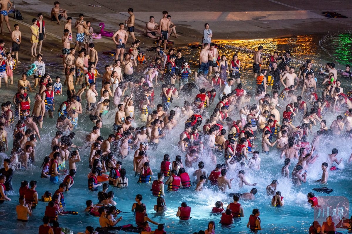 6月15日,成都国色天香水上乐园夜场狂欢开启,游客们在造浪池中享受清凉狂欢夜。C视觉签约摄影师 张翔升 摄