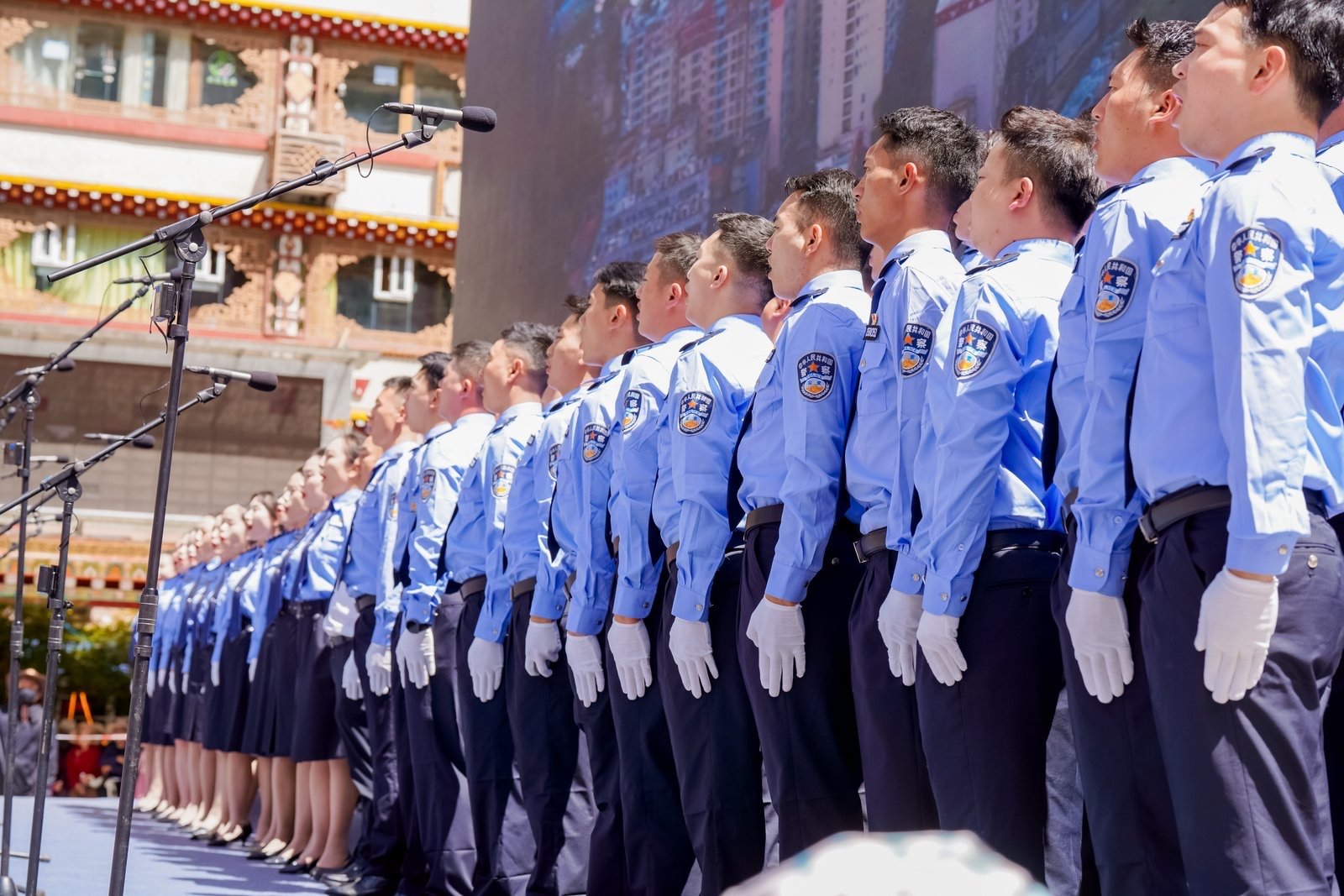 随着“巴扎嘿!”一声高亢的呼喊,沙德片区联队身着藏袍,在舞台上挥舞哈达点燃全场气氛。在《北京的金山上》欢快热烈的节奏里,他们舞步铿锵,笑容灿烂。“我们想用这首经典曲目,把如今雪域高原日新月异的幸福生活,用最热烈的方式唱给大家听!”沙德片区联队领唱李丹说。