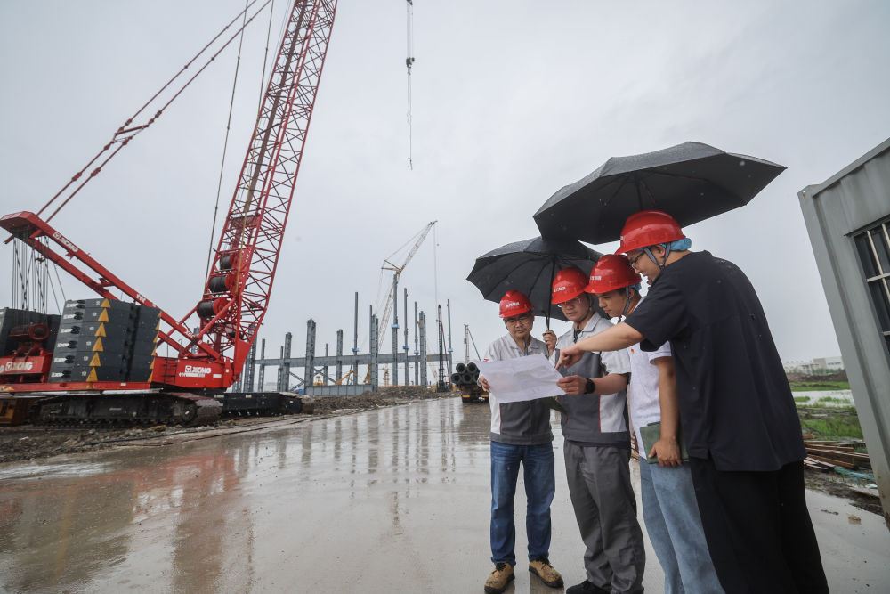 2025年6月10日,在东方特钢镍铬新材智造项目建设现场,浙江省嘉兴市南湖区驻企“红色专班”党员与企业施工方一起查看项目现场推进情况。新华社记者 徐昱 摄