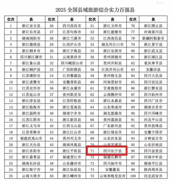 报告显示,四川省11个县入选2025年全国县域旅游综合实力百强县,长宁县是川南唯一一个进入百强县的县市,排名第71位。