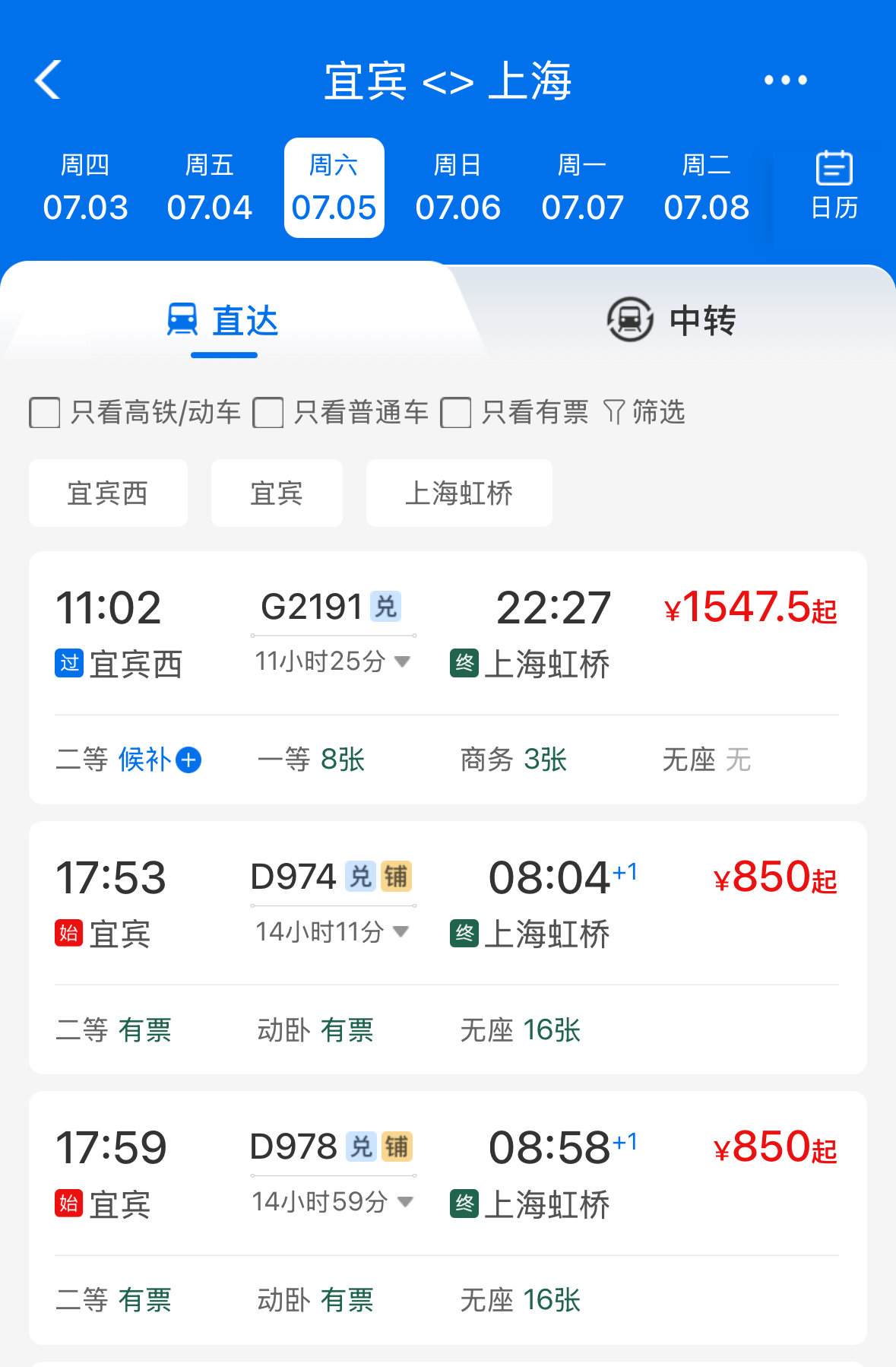 往返宜宾、上海两地的动卧仅在周六、周天、周一开行,每天两趟。每趟车动卧有2个票价,目前售价低于5折,上铺1090元,下铺1220元。