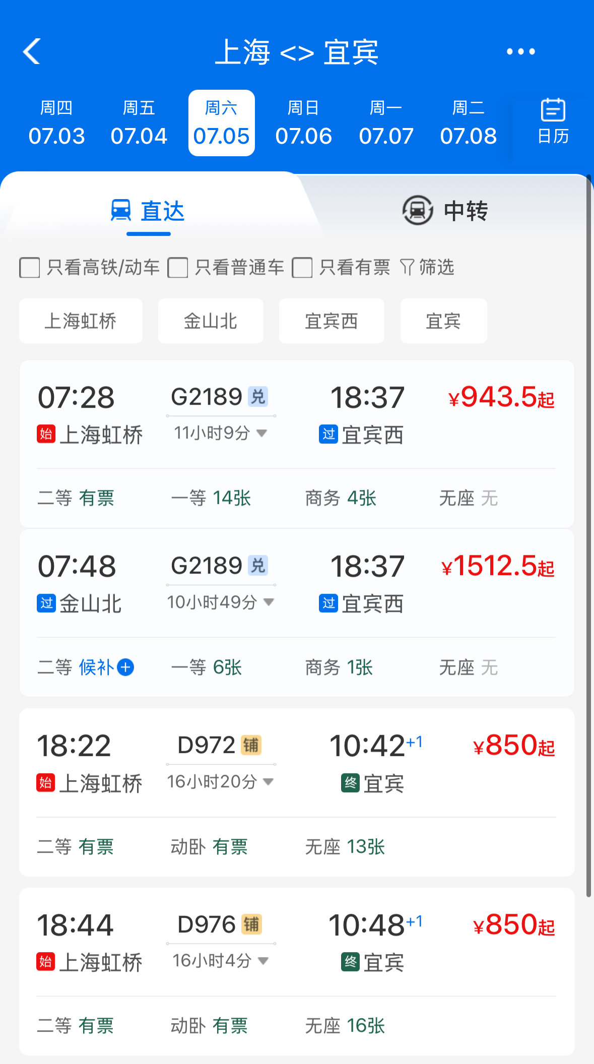 宜宾至上海动卧分别为D974次和D978次,将从宜宾站出发,经眉山、成都、广元、西安、徐州等地,终到上海虹桥站,单程耗时约14小时。