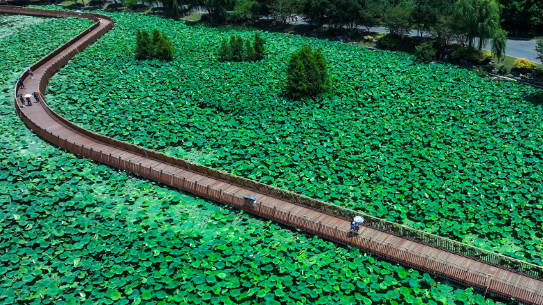 夏日时节,南京玄武湖公园内的荷叶渐密,赏荷栈道隐匿其中,宛如一条通往梦幻仙境的小径,吸引众多市民游客前来漫步休闲,临水赏荷。