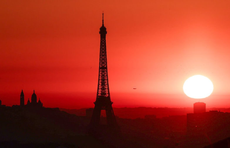这是7月1日日出时分在法国巴黎拍摄的埃菲尔铁塔剪影。