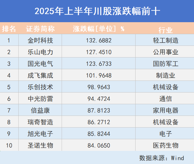 截至6月30日收盘,上证指数半年涨2.76%,深证成指半年涨0.48%,创业板指半年涨0.53%。而川股波动远超大盘,同花顺四川板块指数上半年涨幅达到19.05%。Wind数据显示,179只川股中130只实现上涨,58只涨幅超30%,更有4只个股涨幅超过100%。
