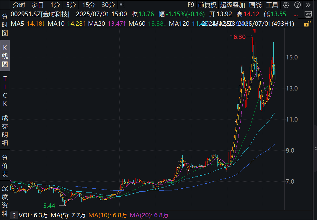 从个股来看,金时科技以132.69%的涨幅登顶。点燃金时科技这轮行情的是今年1月其公众号的一则消息——《金时科技&蚂蚁数科 共绘新能源全球生态新蓝图》。今年5月下旬以来,随着美国、中国香港等国家和地区稳定币立法推进,叠加稳定币巨头Circle上市,A股金融科技板块迎来上涨,不仅稳定币概念横空出世并录得飙升,与其相关的科技金融产业链也跟随上行,金时科技就因上述的一则消息被列入相关概念走出翻倍行情。