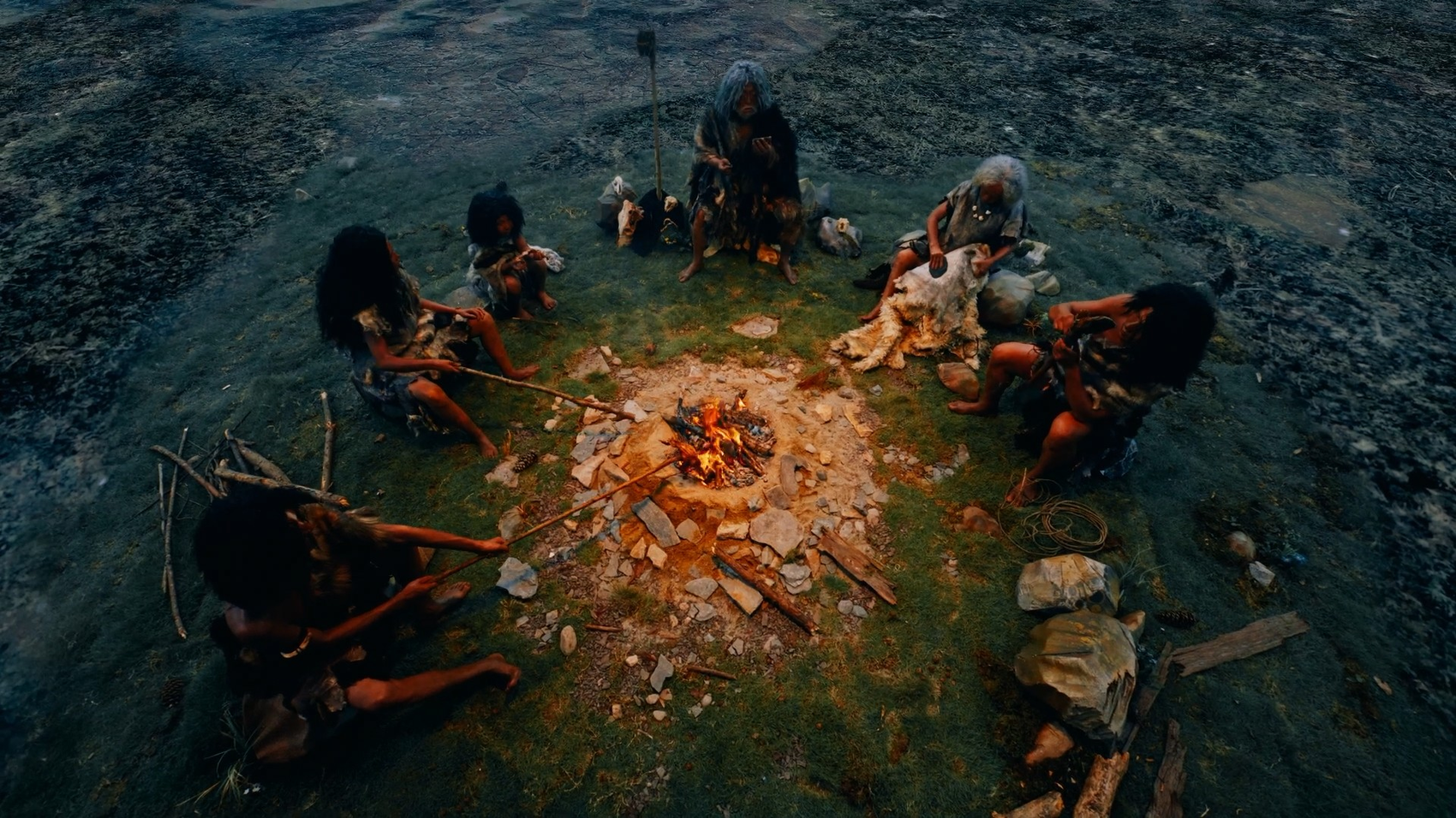 在画面中,原始人在跋涉、在打制手斧,旁白娓娓道来:“远古人类扬起手斧,犹如一颗星星划破夜空。文明的种子就此埋下,等待着若干年后的破土而出。”“分工与合作已经出现。正是靠着由此产生的团结,人类披荆斩棘,一路向前……”