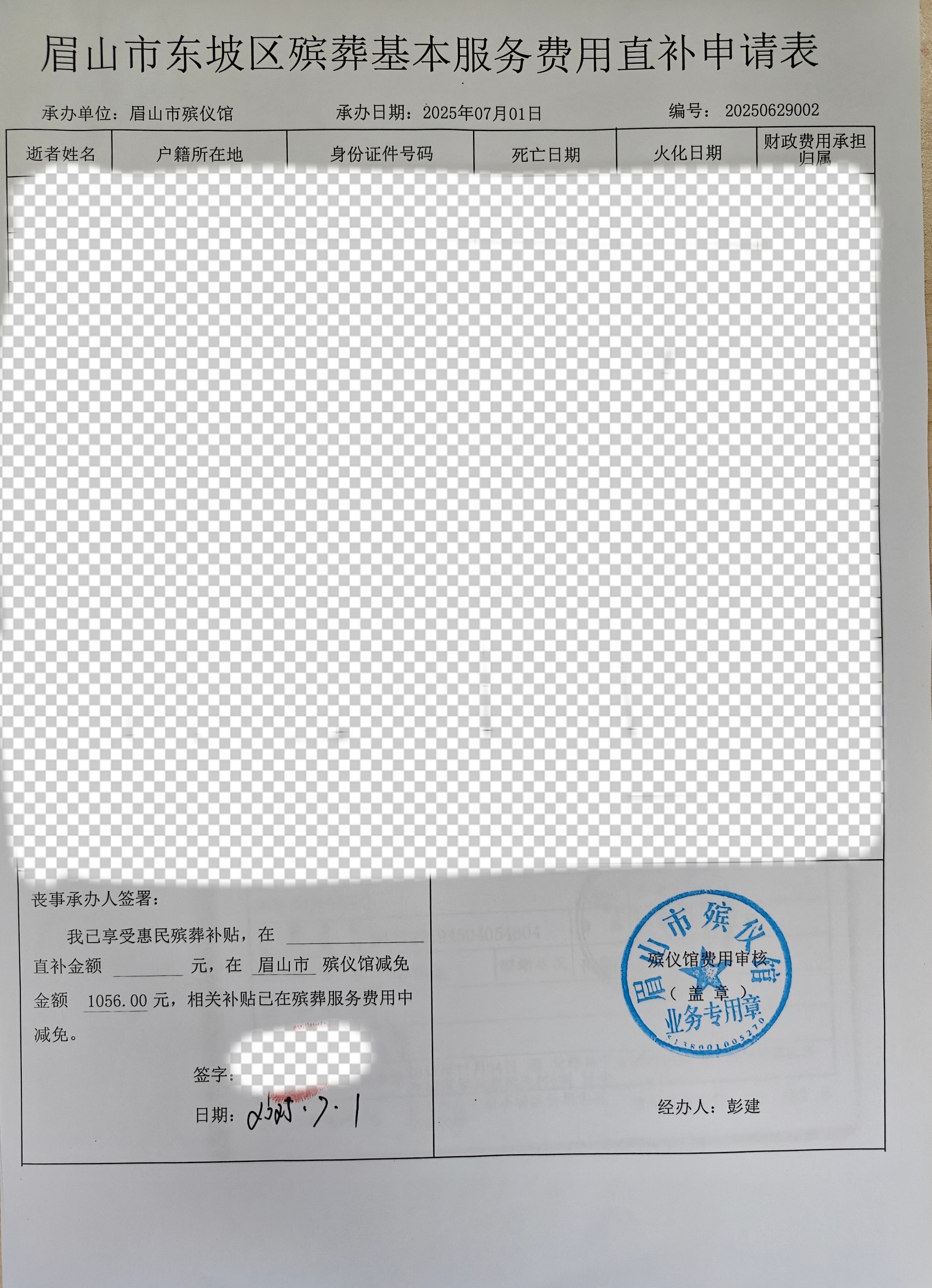 此前,只有仁寿县实行 “一站式直补”。为进一步织牢民生兜底保障网,今年5月,眉山市民政局联合眉山市财政局发布通知,对眉山市绿色惠民殡葬政策进行优化升级,在全市范围内推行殡葬基本服务费用 “一站式直补”。