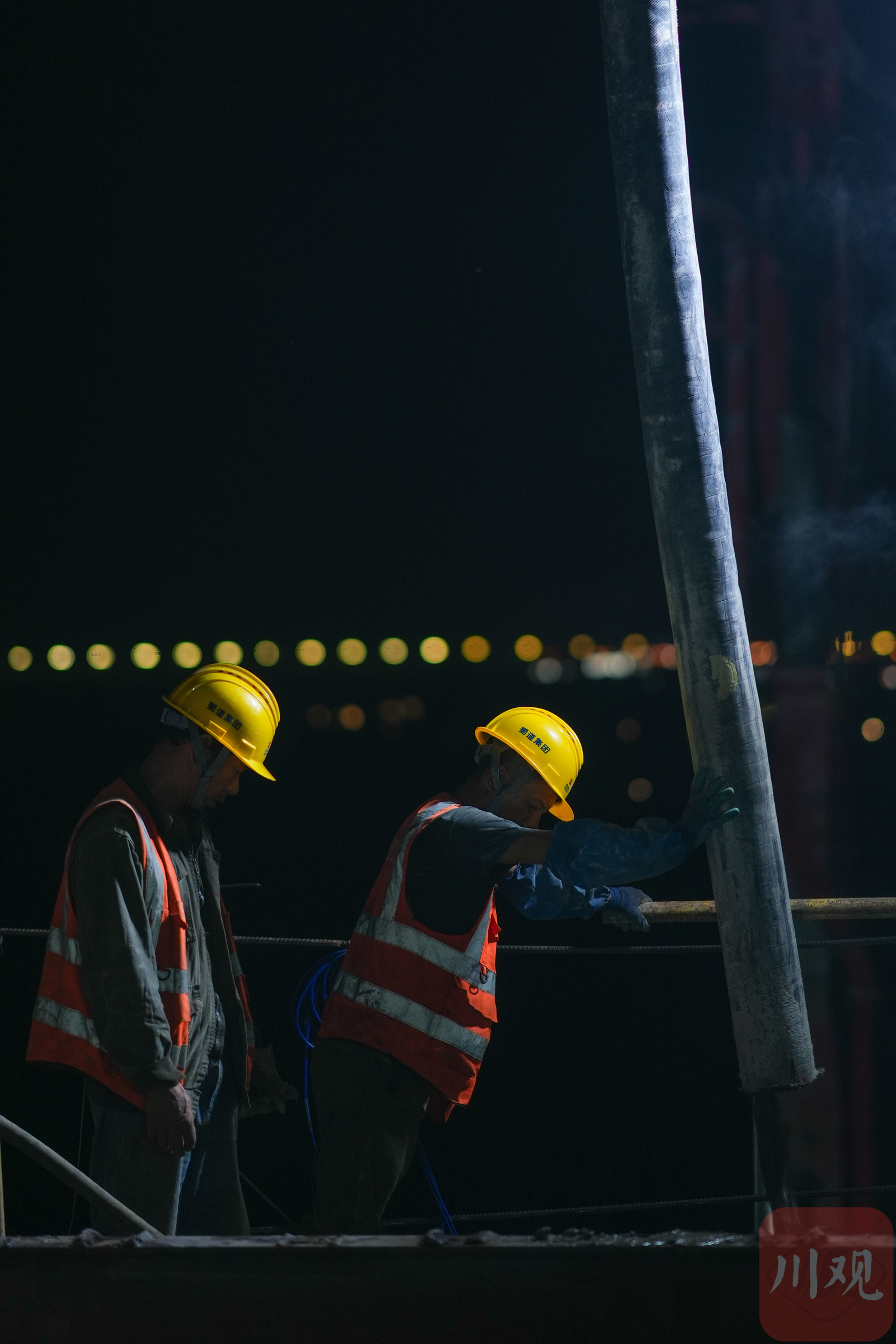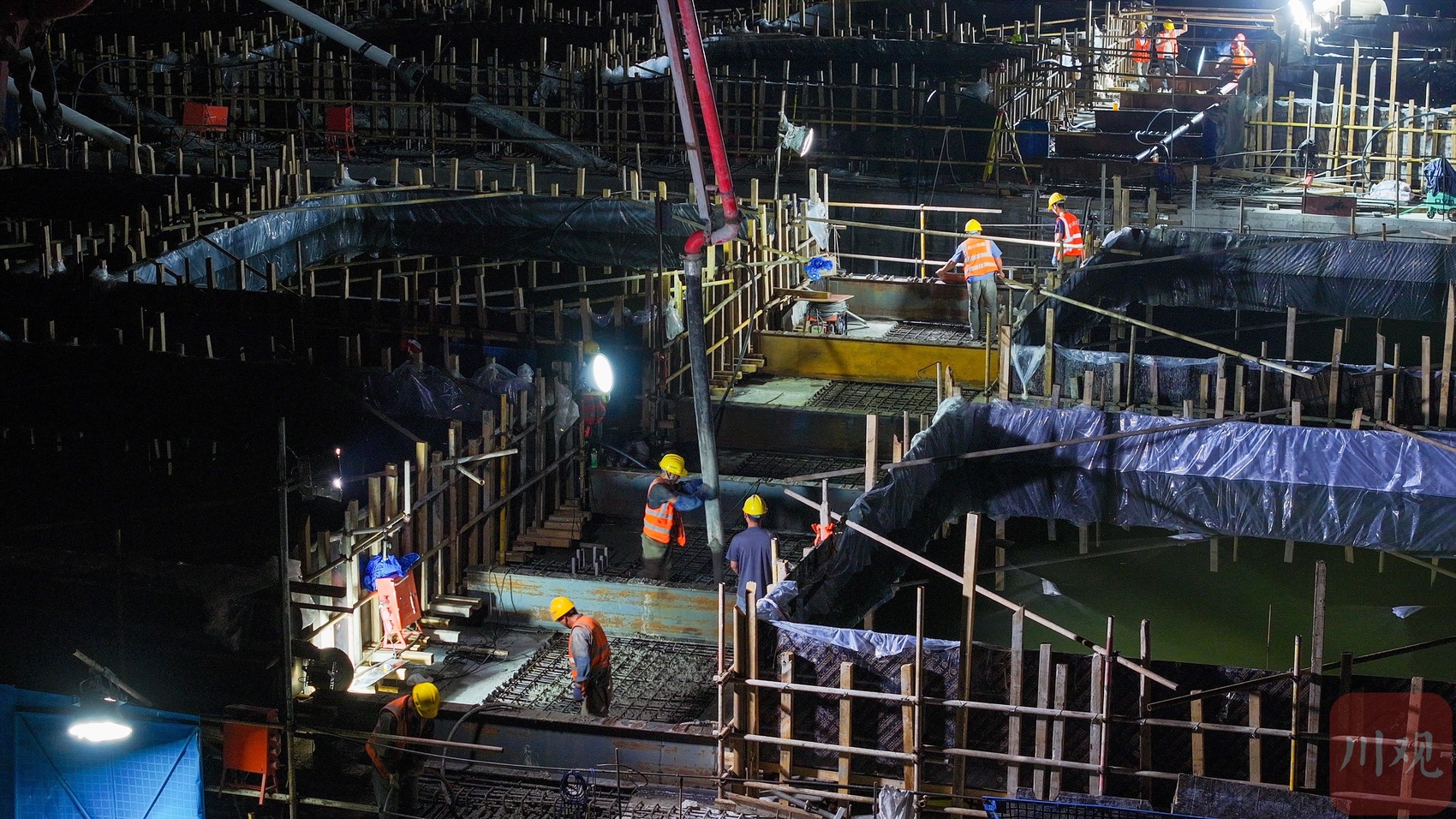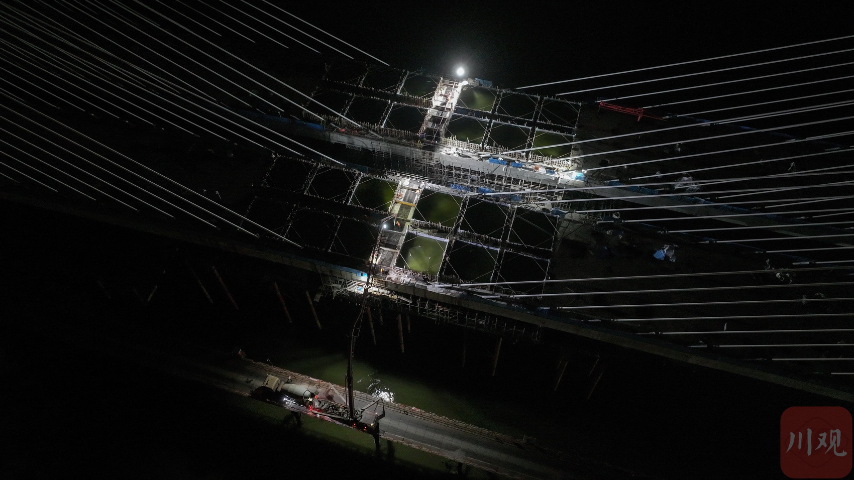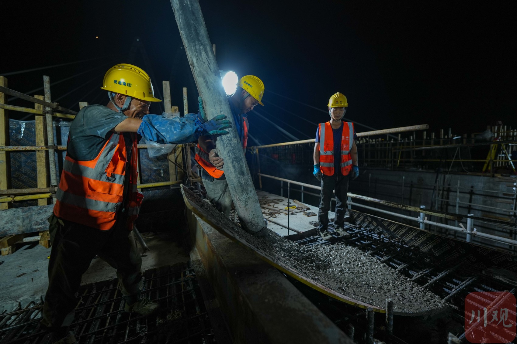 2025年6月30日晚,遂宁市涪江六桥主跨顺利合龙,现场工人们正在进行最后一段混凝土浇筑施工。