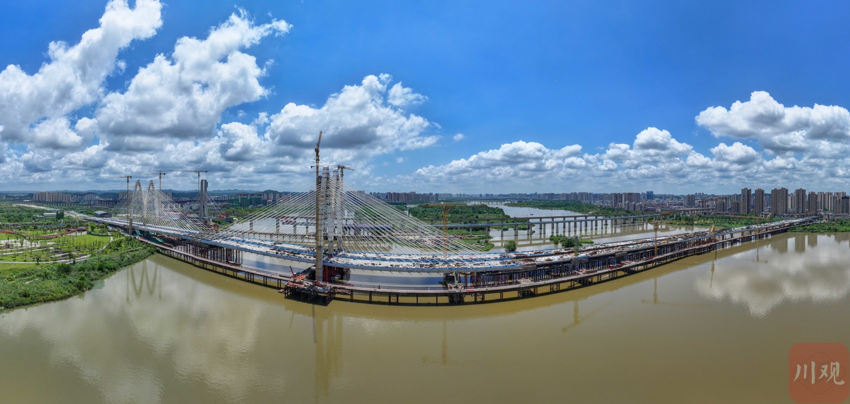 2025年7月1日,航拍遂宁市主跨已顺利合龙的涪江六桥,标志着大桥主体工程基本建设完成。