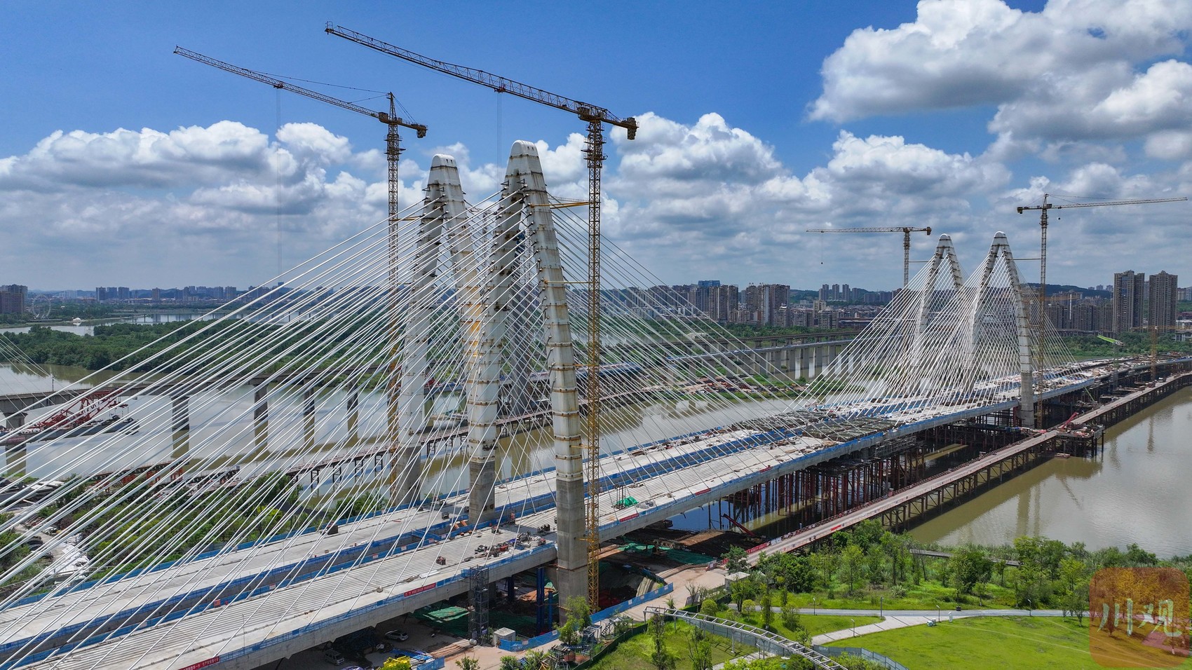 据悉,该项目全长3215米,是遂宁首座双塔五跨混凝土梁斜拉桥。采用国内首个主桥主梁施工移动支架法、“内置+外置劲性骨架”的独创性合龙工艺等技术,确保各项施工有序开展。项目建成后,对推动遂宁高质量发展,助力成渝地区双城经济圈建设有重要意义。