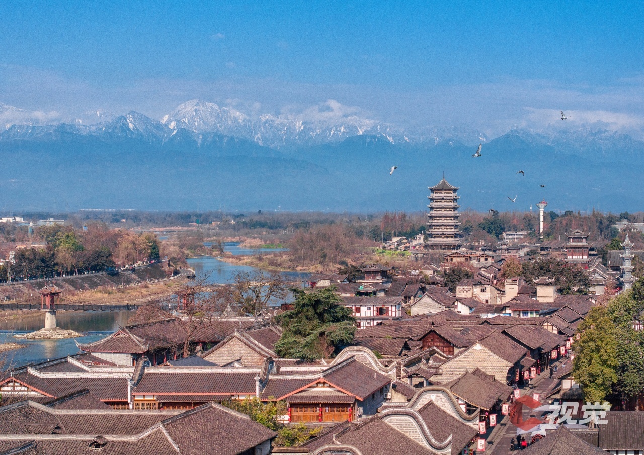 2月25日清晨,飞鸟掠过元通古镇,与连绵雪山相映成景。C视觉签约摄影师 沈军