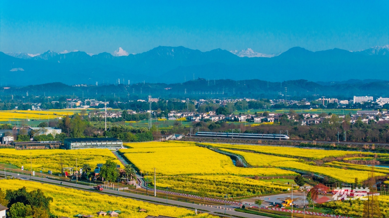 3月24日,在崇州市白头镇五星村,幺妹峰和大雪塘一同现身,目送飞驰的动车穿过金灿灿的油菜花海,构成了一幅美丽的乡村画卷。C视觉签约摄影师 李旭
