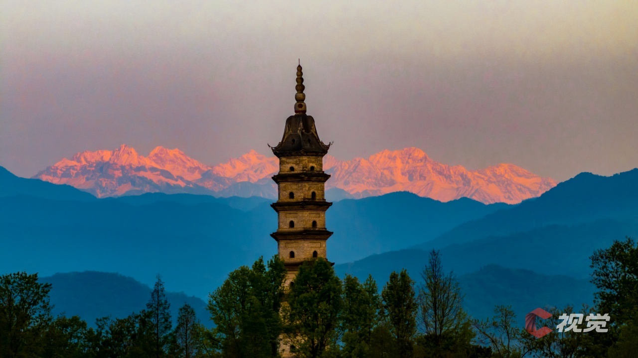 4月8日清晨,崇州怀远镇回澜塔与雪山“日照金山”同框。C视觉签约摄影师 杨武