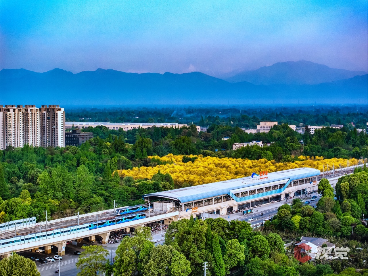 4月19日,成都地铁19号线金星站的黄花风铃木开得正艳,幺妹峰在远处显露真颜,美不胜收。C视觉签约摄影师 张礼彬