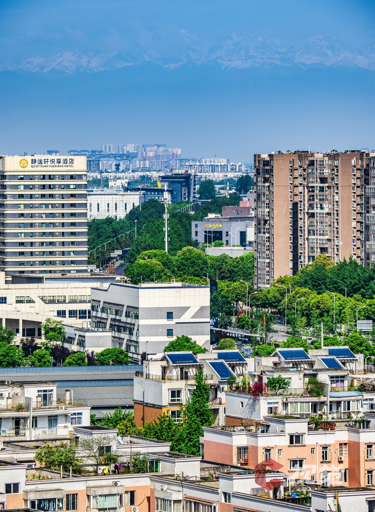 4月30日,在四川大学江安校区附近,雪山与城市群同框。C视觉签约摄影师 刘耀飞