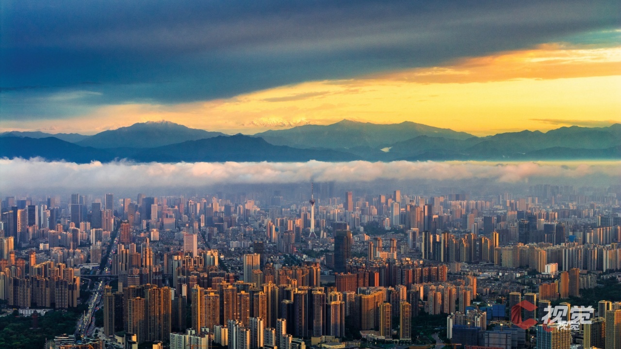 4月30日,高新区的写字楼群玻璃幕墙折射着流动的光轨,远处大雪塘与幺妹峰浮在靛蓝暮色中。C视觉签约摄影师 张翔升