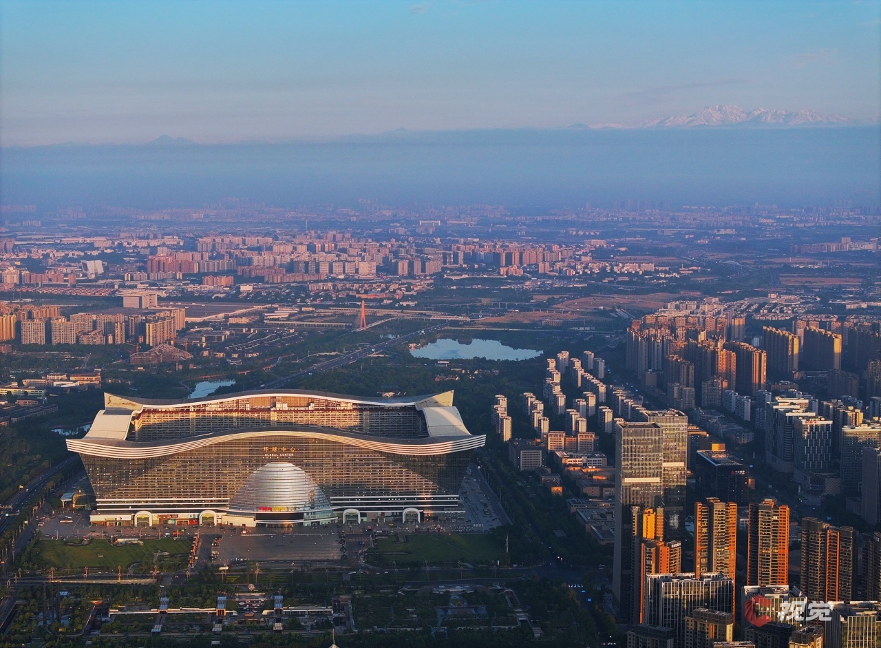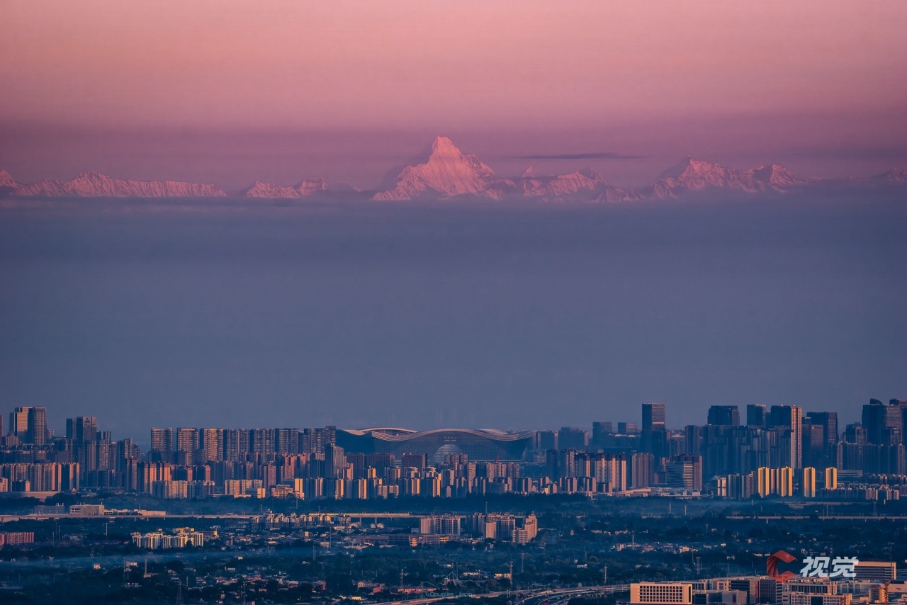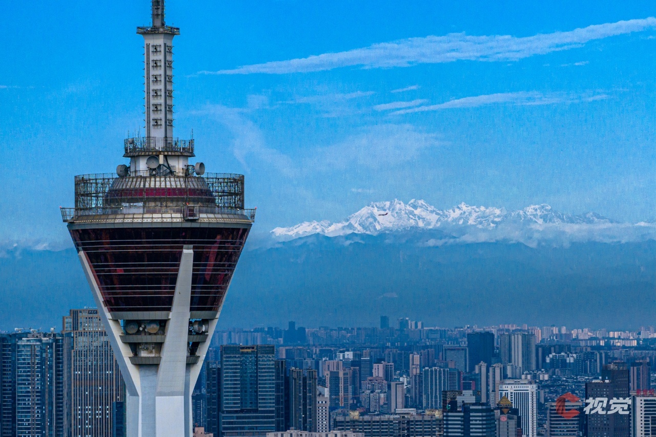 5月5日,成都标志性“天府熊猫塔”与雪山同框。C视觉签约摄影师 龚全意