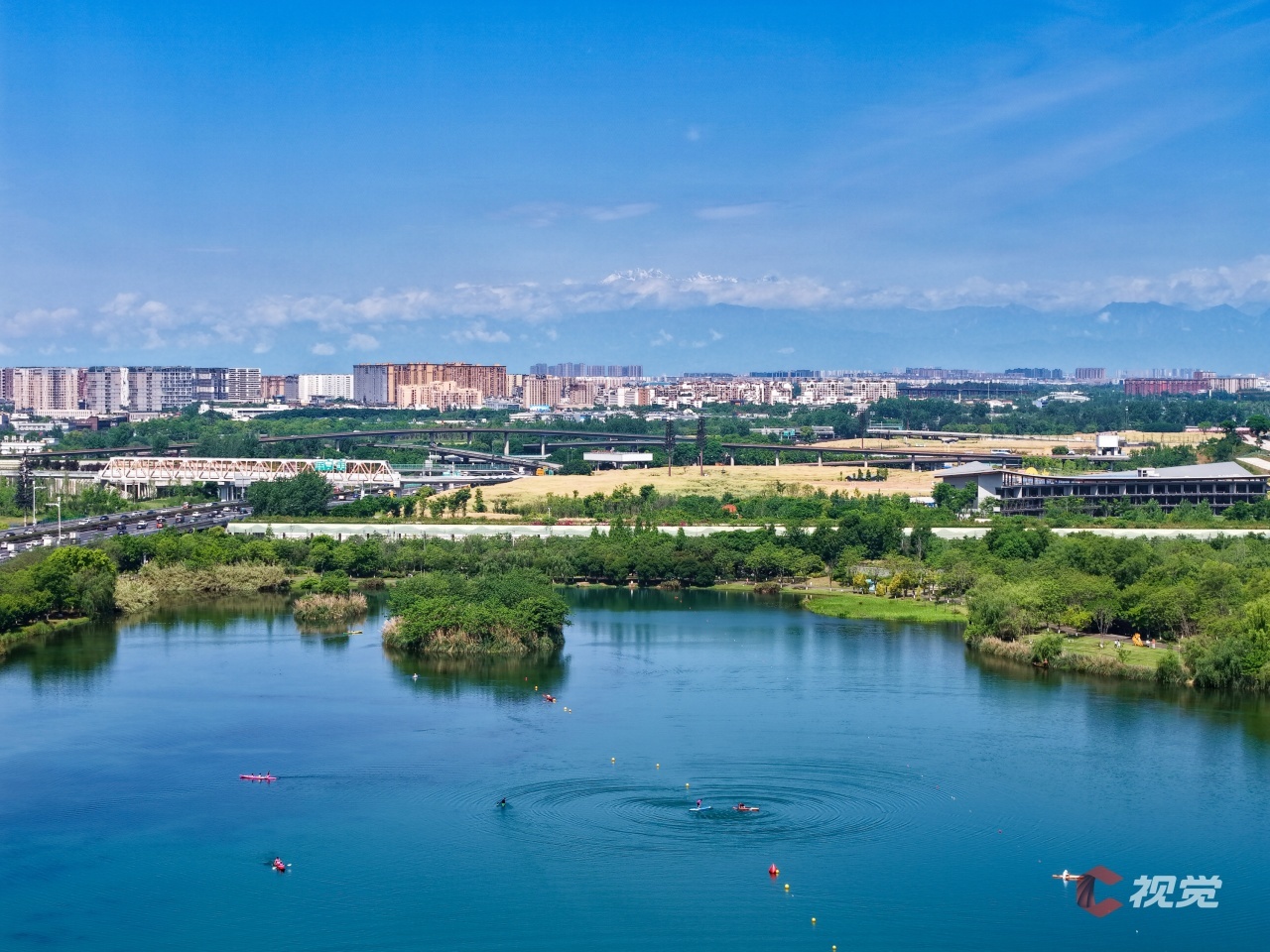 5月5日,高新区锦城湖,远处连绵皑皑雪山环抱,湖里划船的人们悠然自得。C视觉签约摄影师 李昀波