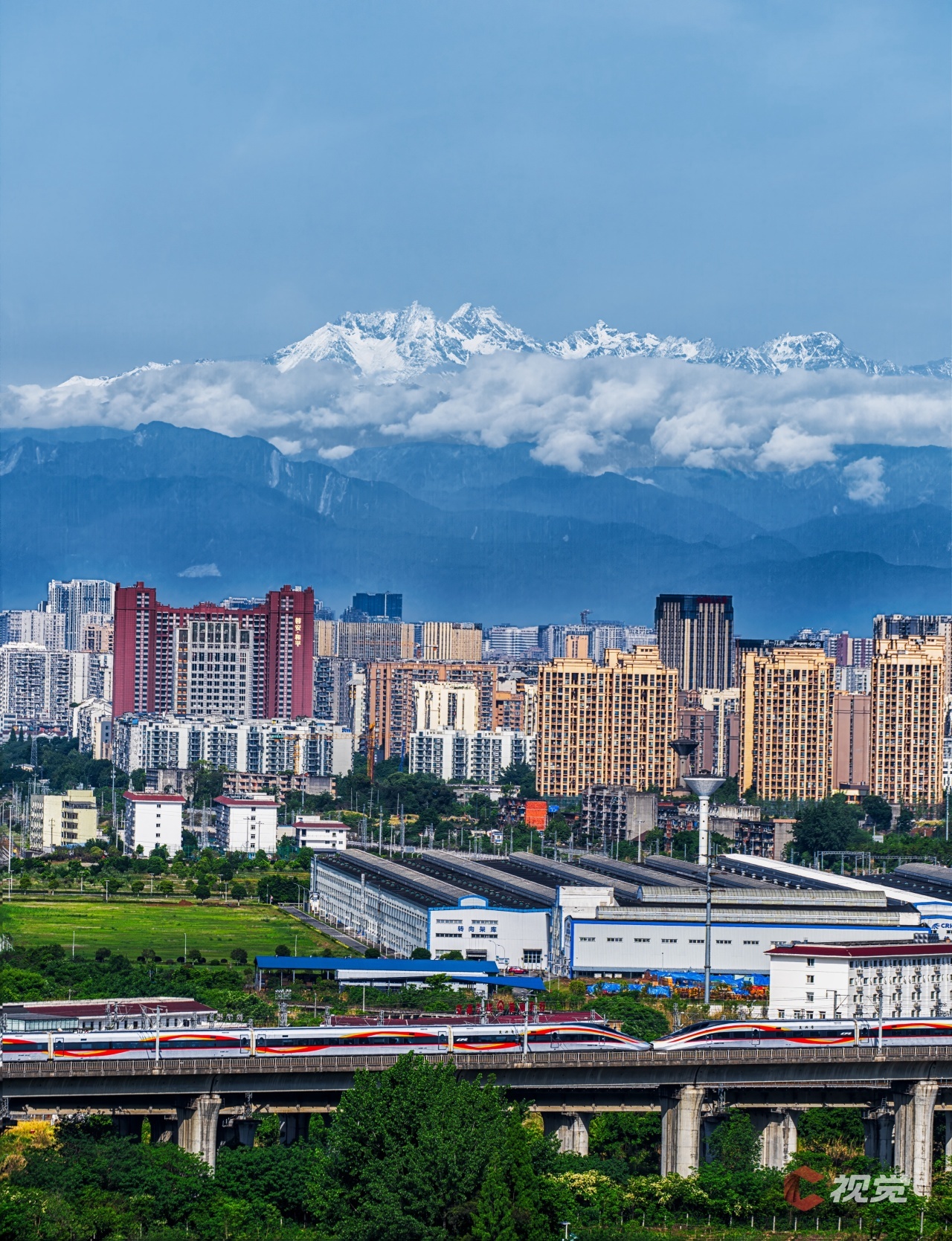 5月5日,一列高铁行驶在雪山之下的城市楼宇之间。C视觉签约摄影师 安咏涛