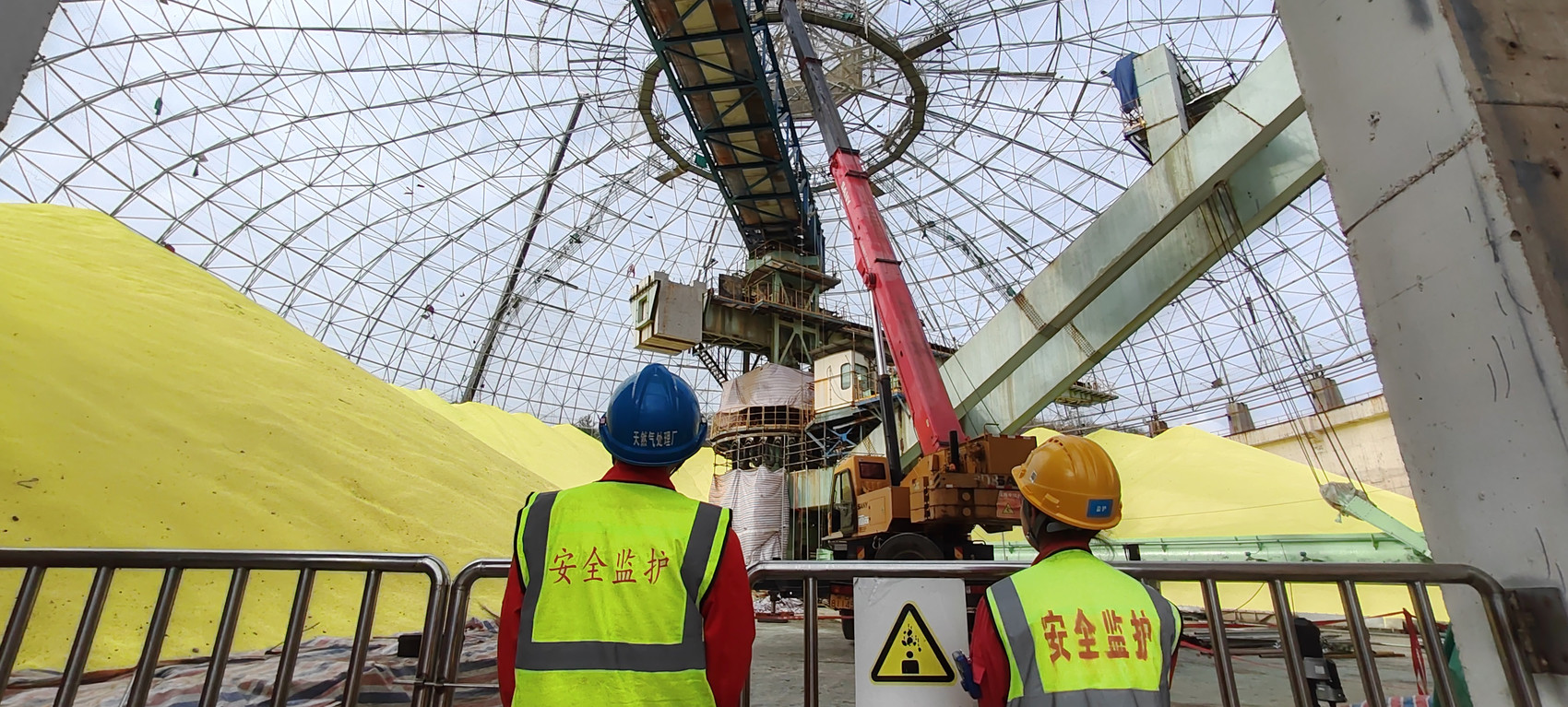 普光气田硫黄料仓为圆形结构,仓内直径80米,穹顶距地面最高处40米。为确保施工安全,天然气净化厂实施“五三安全工作法”,构建起安全可靠的立体防护体系。