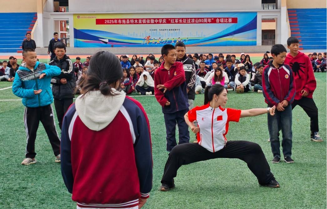 在布拖县,成都体育学院支教队伍创编彝族特色课间操,为县内万余名学生对口搭建体育支教交流平台,“体育为载体、精神为内核”的体育支教新路径正持续发展。在布拖县依撒中学,世界冠军赖柳燕结合“哪吒”形象和武术技巧,将南拳南刀技艺带入课堂。