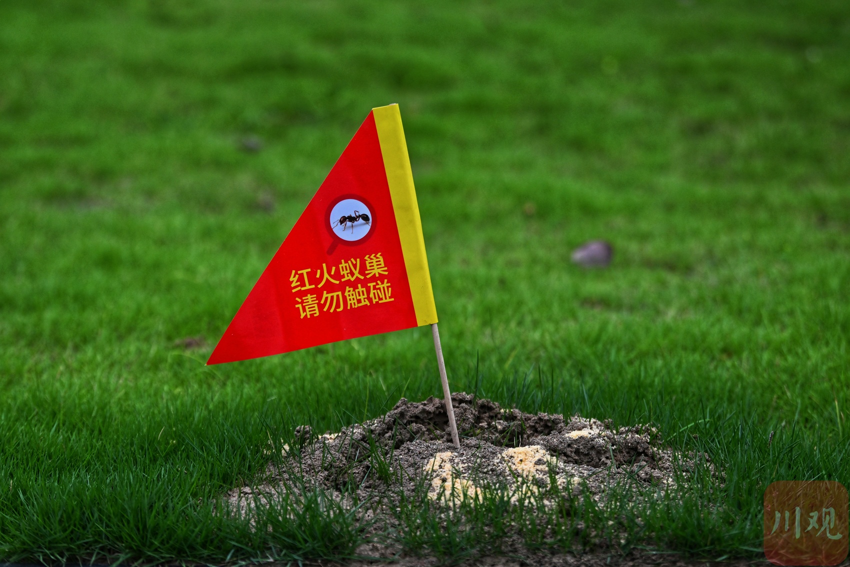 7月2日,在成都高新区新裕南三路附近的一块草坪空地上,记者看到了几处分散的小土堆。土堆上洒有黄色药剂,并插着红火蚁警示旗、拉起围栏,提醒行人远离。轻轻挪动小旗,可见大量蚂蚁沿着旗杆快速攀爬。