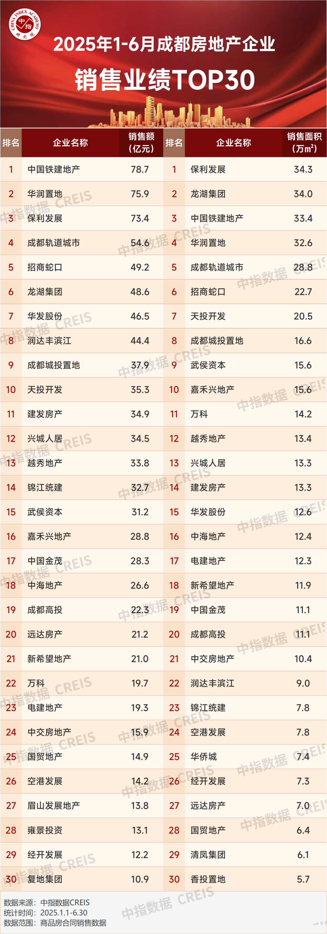 7月1日,中指研究院西南分院发布2025年1-6月在蓉房地产企业销售业绩TOP30榜单,哪些房企的销售业绩亮眼?