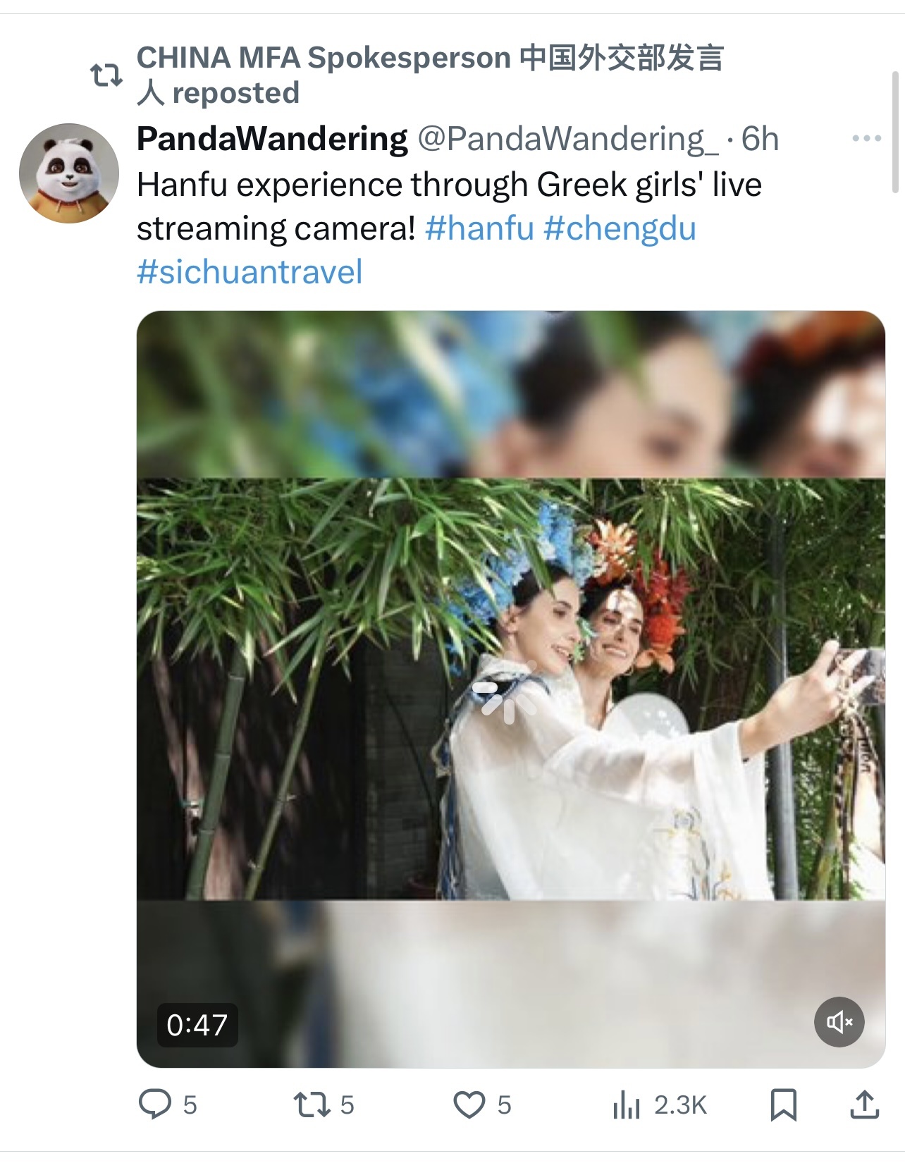 近日,中国外交部发言人账号在X(原推特)上连续转发两条与四川相关的国际互动动态。
