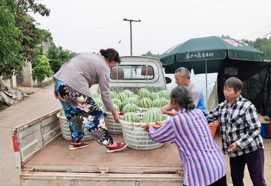 瓜熟听声,生瓜叮咚,熟瓜嘭嘭……近日,在童家镇星桥村集体经济西瓜种植基地内,工人忙着采摘西瓜。