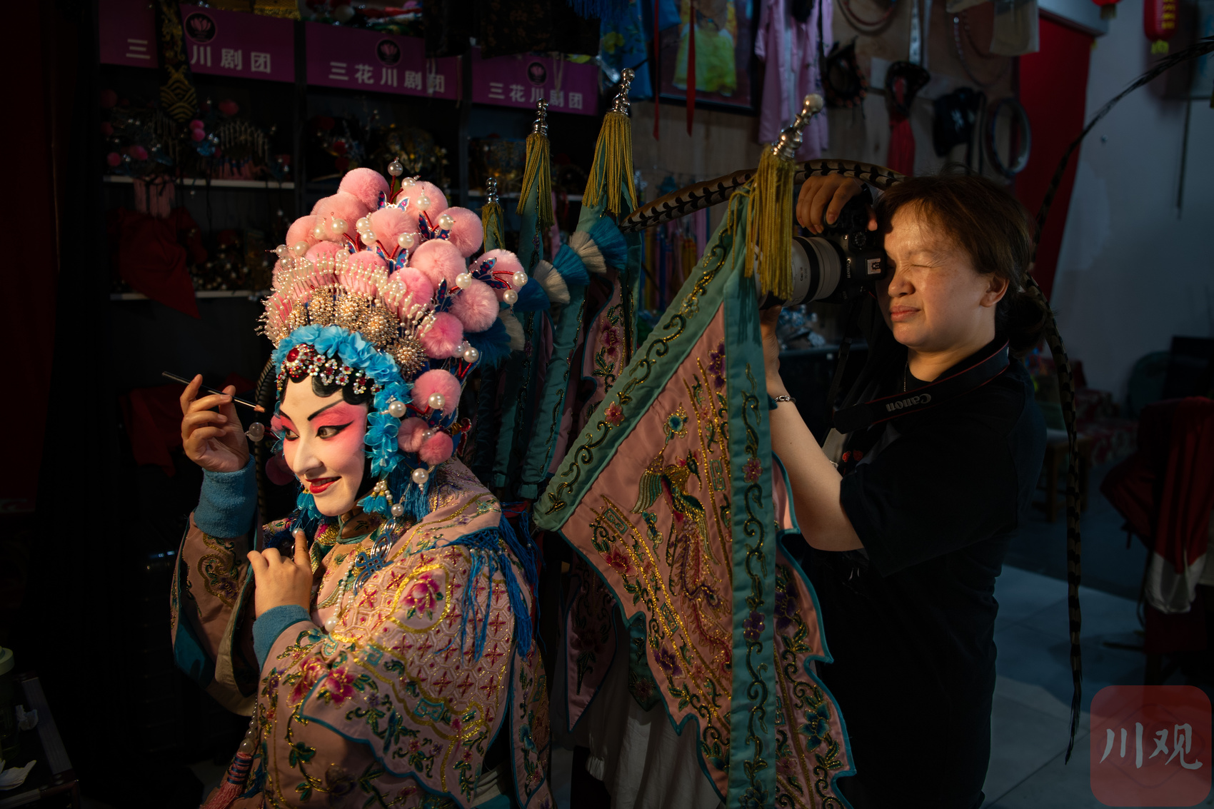 “这家川剧团不一样!”6月11日上午,博主杨玉玲在成都三花川剧团化妆间里边化妆边直播。直播间的网友看到她的装扮后,弹幕刷屏:“这妆造绝了!”“求定位!”“太安逸了!”……