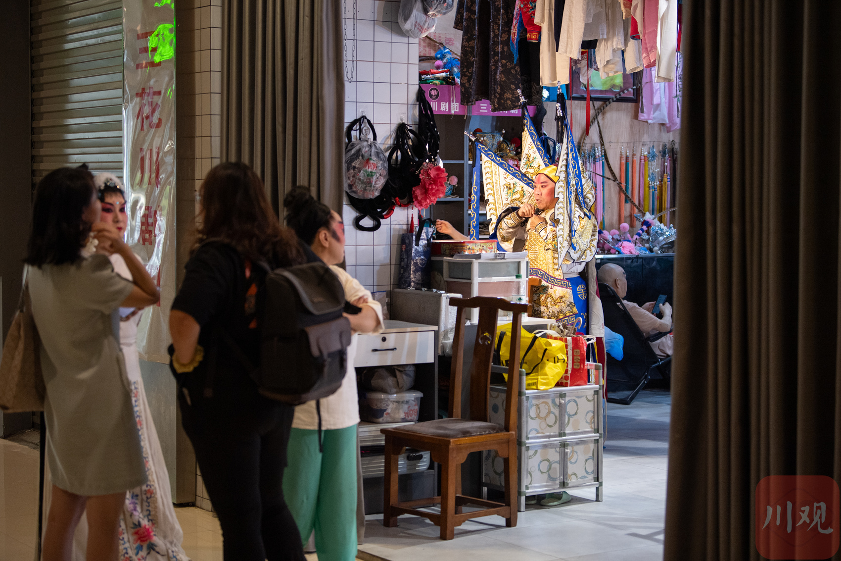 6月10日,三花川剧团的演员在开放式化妆间准备装束,过往路人驻足观看。