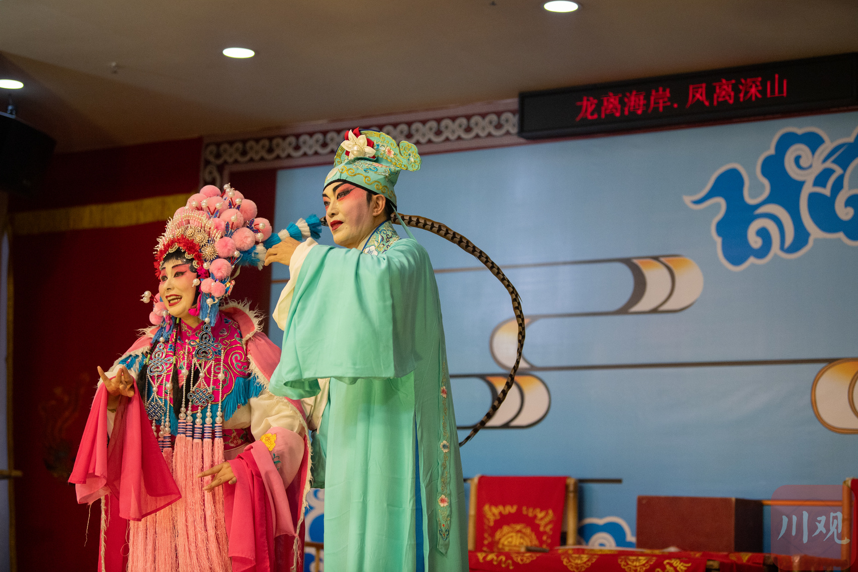 为了让年轻人听懂、看懂川剧传统剧目,剧团在舞台上安装了字幕机。图为6月14日的演出现场。