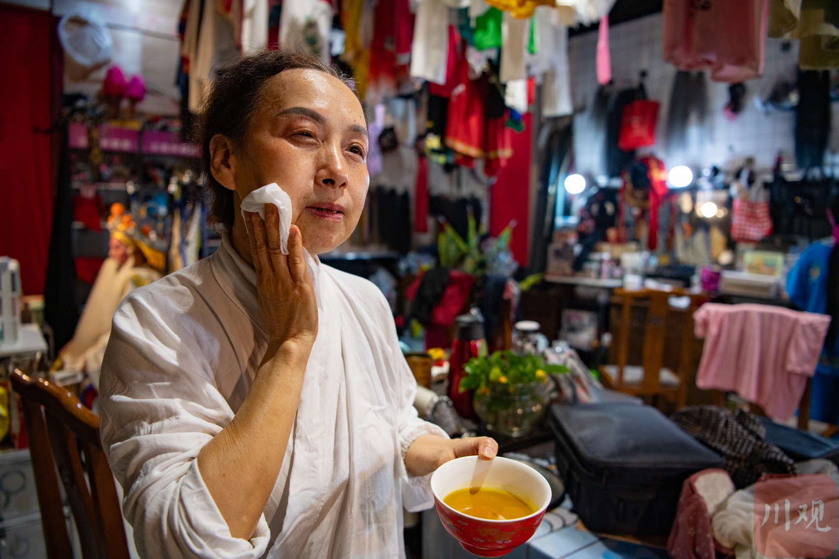 画传统川剧脸谱需要很厚的妆造,演员一般都用菜籽油卸妆。6月10日,演出完的演员正在卸妆。