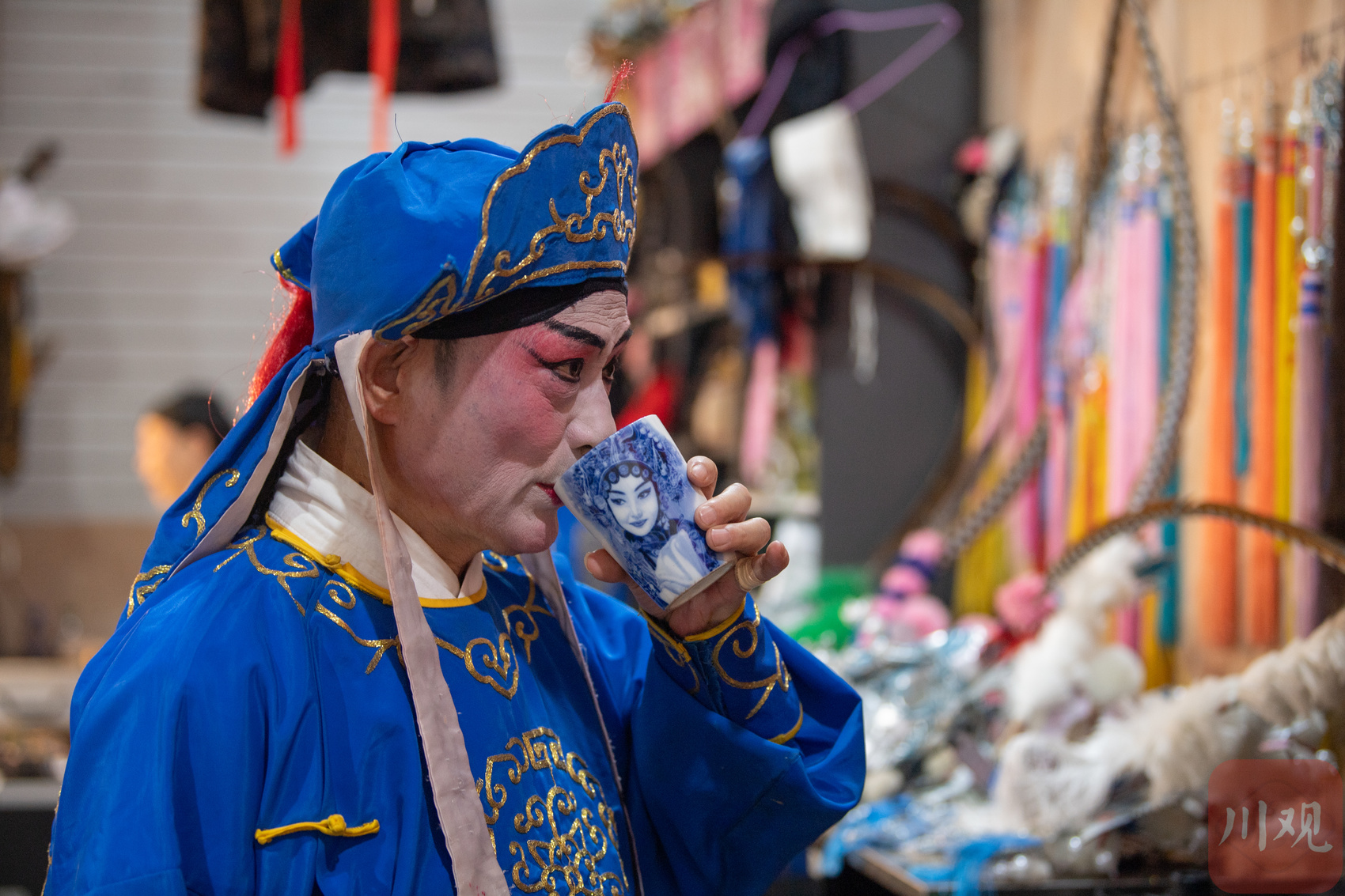 6月10日,演员在休息室用印有脸谱的水杯喝水。该剧团围绕川剧推出了多款文创产品,深受观众和游客的喜爱。